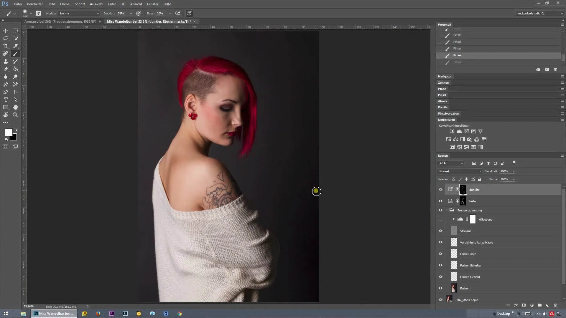 Po usunięciu plam w tle, powinieneś także przyjrzeć się włosom, które mogą być nadal widoczne. Często te drobne niedoskonałości nie są od razu zauważalne, ale po zakończeniu edycji często stają się nieakceptowalne. Z nową warstwą (nazwaną „Korekta Kolor Włosy”) możesz skupić się na włosach.