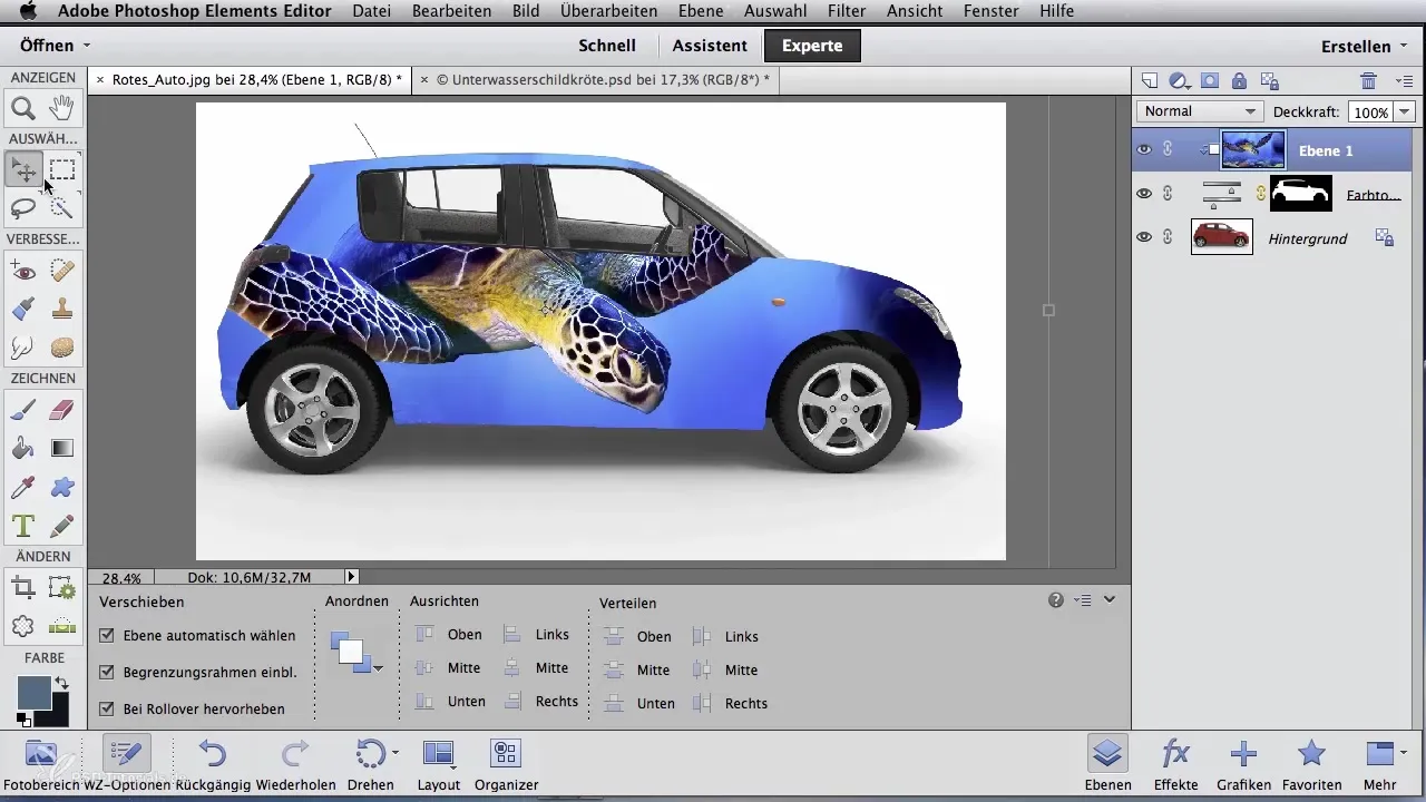 Jak mogę zintegrować motyw z moim obrazem pojazdu?Scal warstwy, użyj narzędzia przesuwania i stosuj maski do wklejenia i dostosowania motywu.