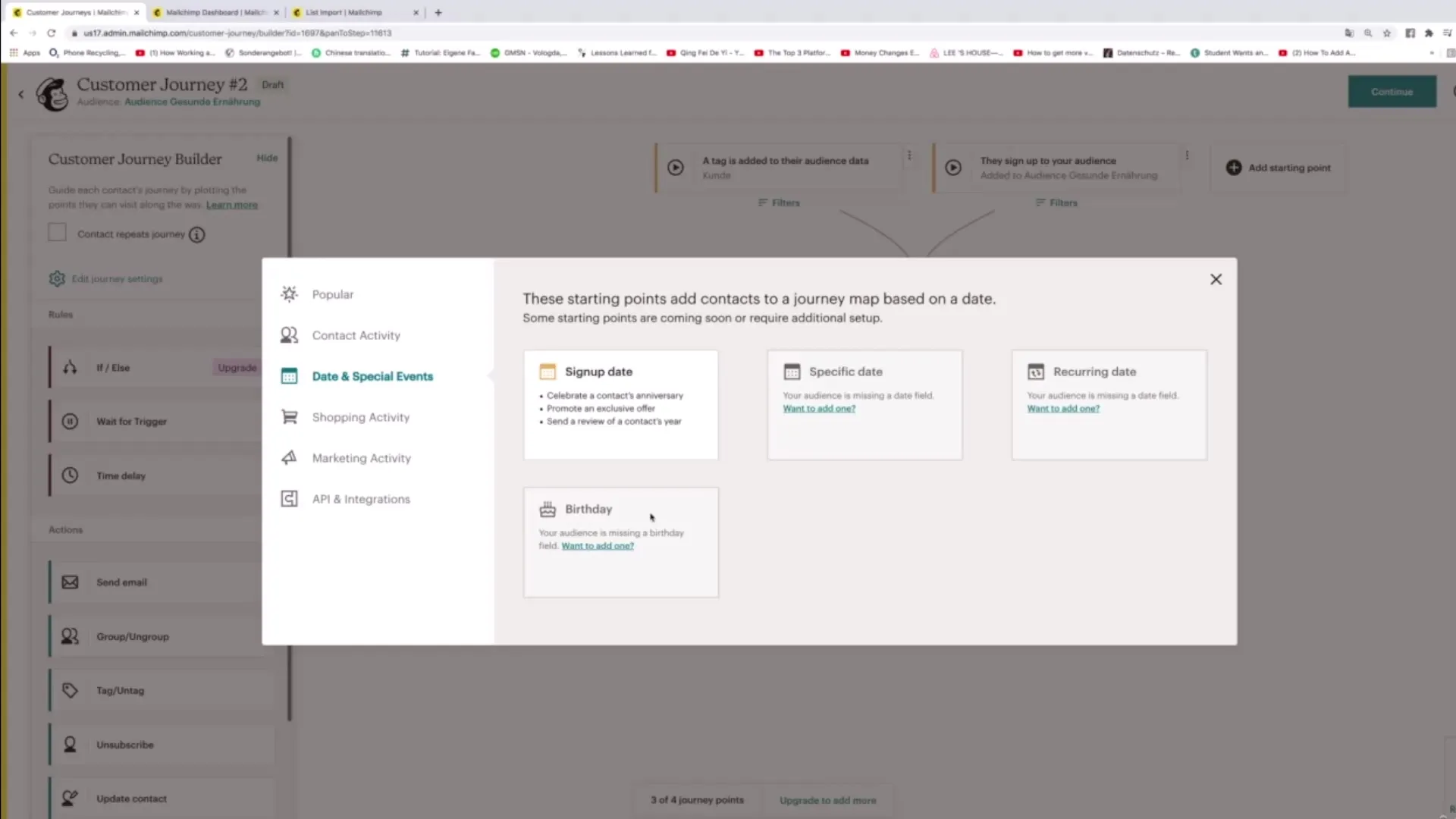 Wybierz tag, na przykład „Geburtstag”, i połącz go z odpowiednią Customer Journey. Tak, gdy twoje kontakty mają określony tag w dniu swoich urodzin, automatycznie wejdą do Journey, która zawiera życzenia urodzinowe.