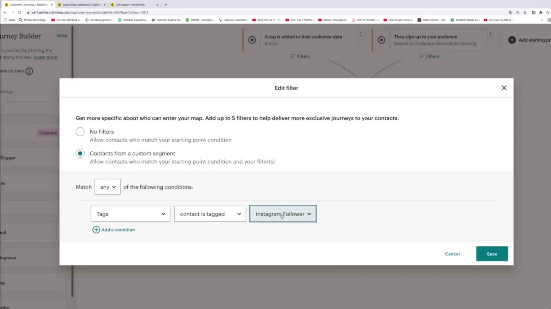 Gdy dodajesz filtry, możesz na przykład zapewnić, że tylko kontakty, które spełniają określone tagi lub cechy, wejdą do twojej Customer Journey. Możesz ustalić, że tylko kontakty z tagiem „Kunde” oraz tagiem „Instagram Follower” otrzymają odpowiedni e-mail.