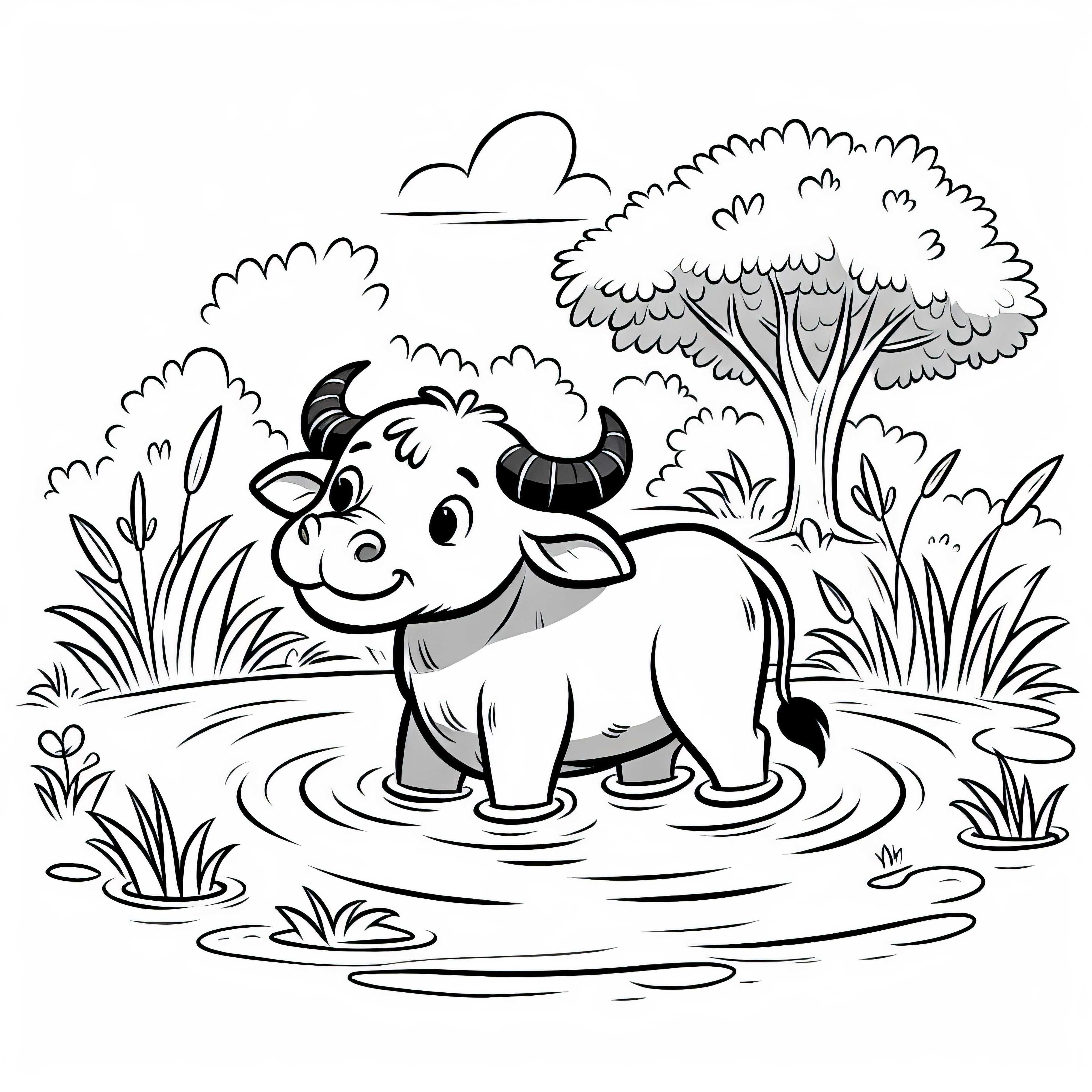 Búfalo de água está até a barriga em pântano e se refresca - Desenho para colorir simples e gratuito