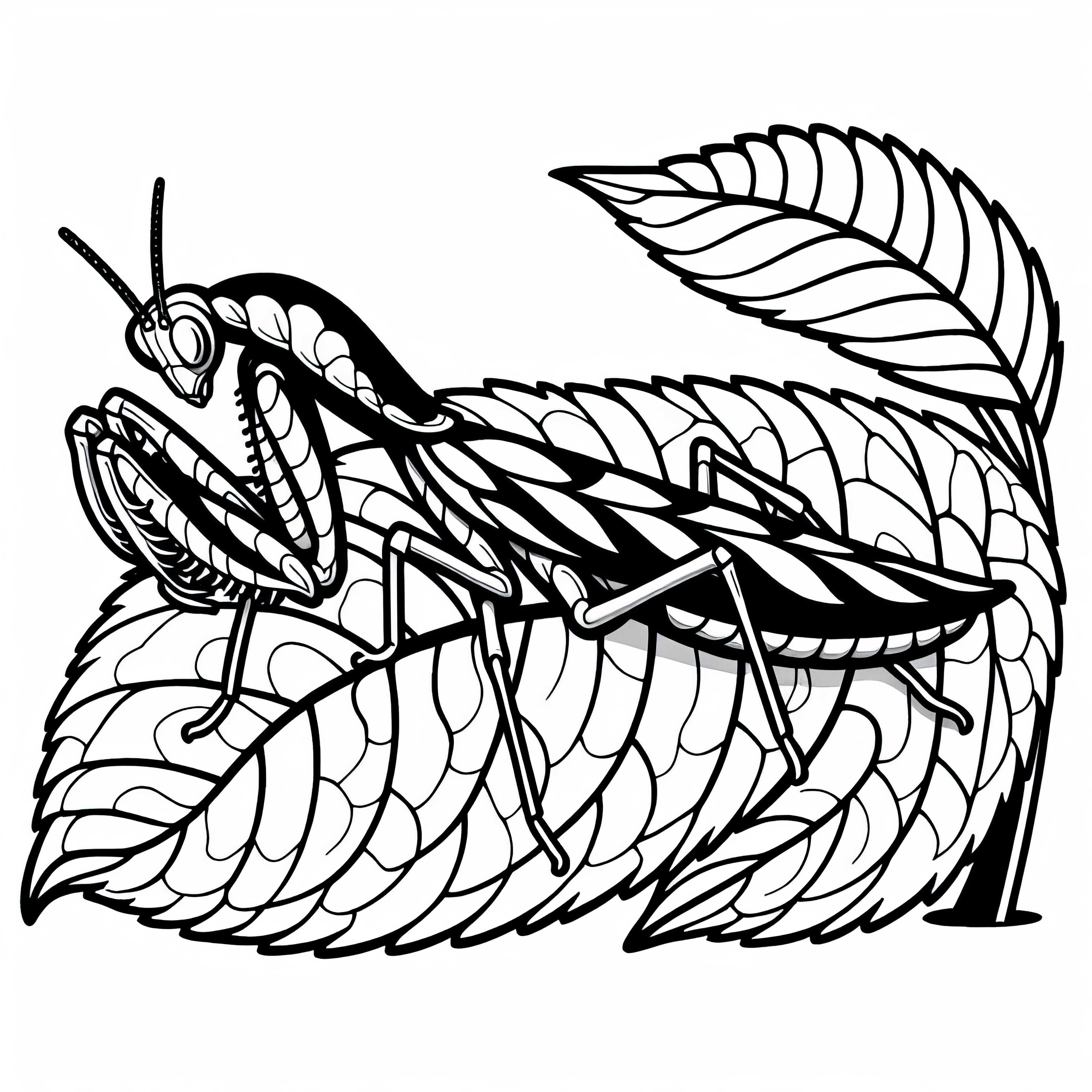 Louva-a-deus está sentada em uma folha e se camufla - Desenho para colorir gratuito