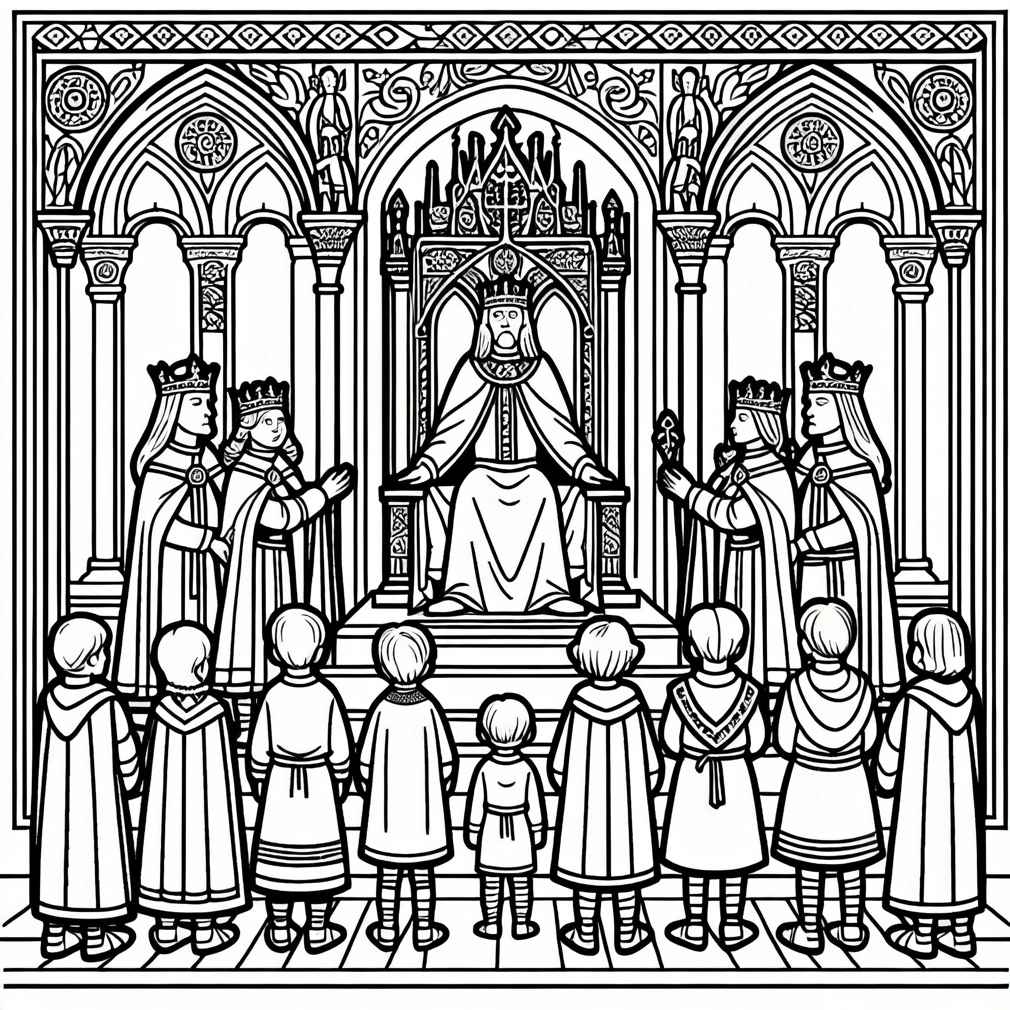 Crianças diante do trono de Carlos Magno. Baixe a imagem agora e comece a colorir!