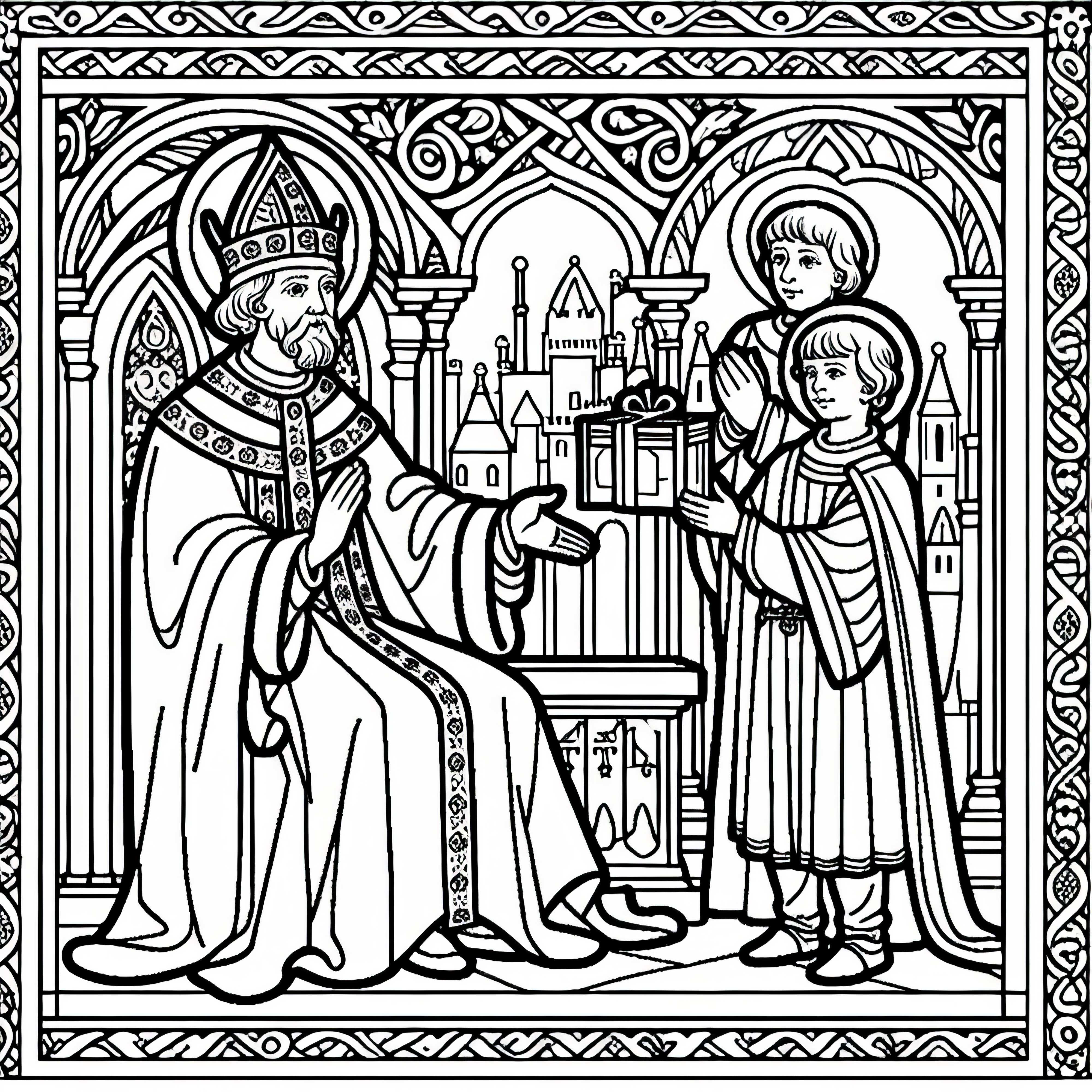 Nesta imagem para colorir, você vê uma cena impressionante em que Carlos Magno recebe um presente. Ela mostra uma representação vívida da época do famoso governante, que te mergulha na história. A imagem é ideal para explorar sua criatividade ao colorir. O melhor de tudo: você pode baixar esta imagem para colorir de alta qualidade gratuitamente. Seja para imprimir ou para colorir online – pegue a imagem para colorir agora!