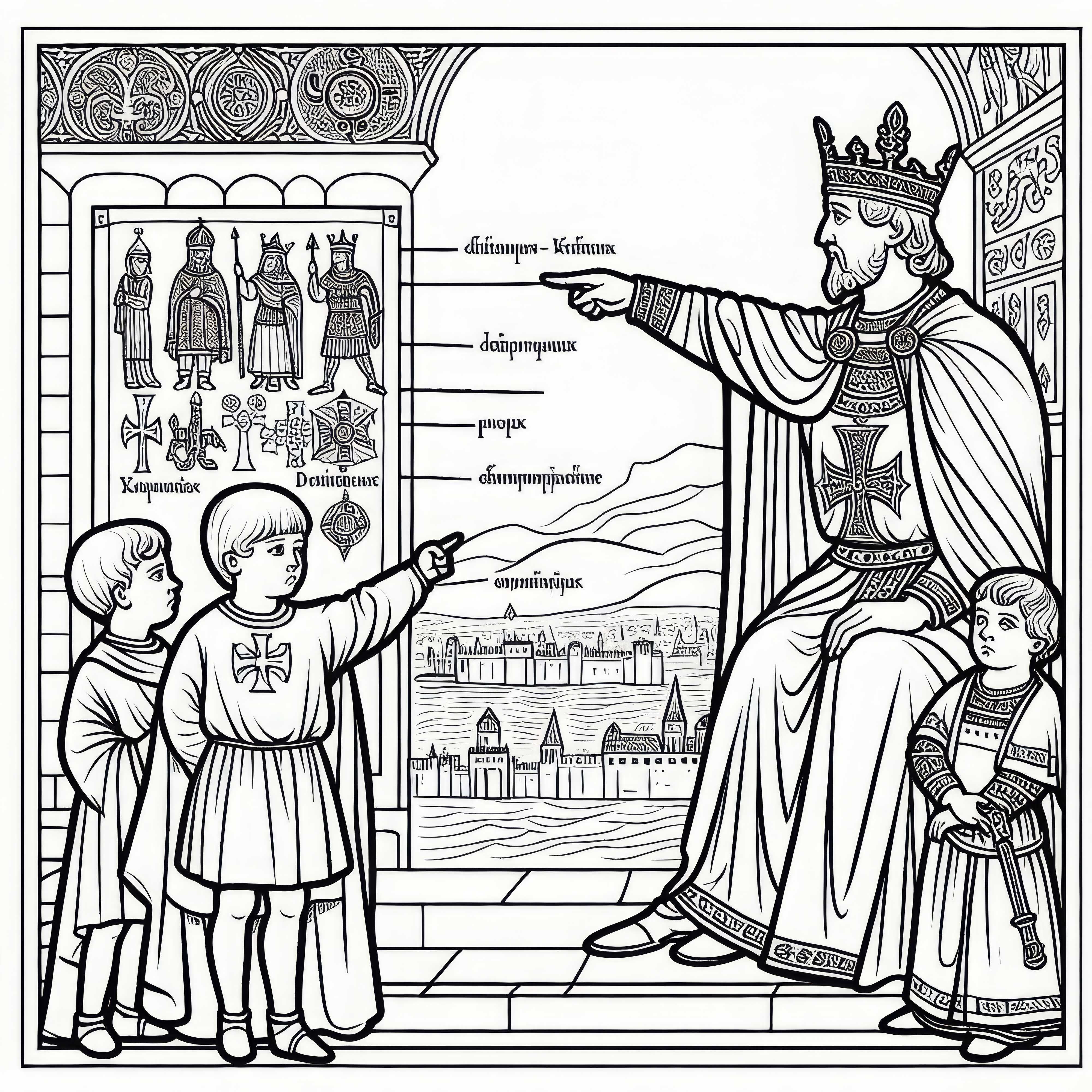 Crianças ouvem o monge explicar o pergaminho - Desenho para colorir Carlos Magno gratuito
