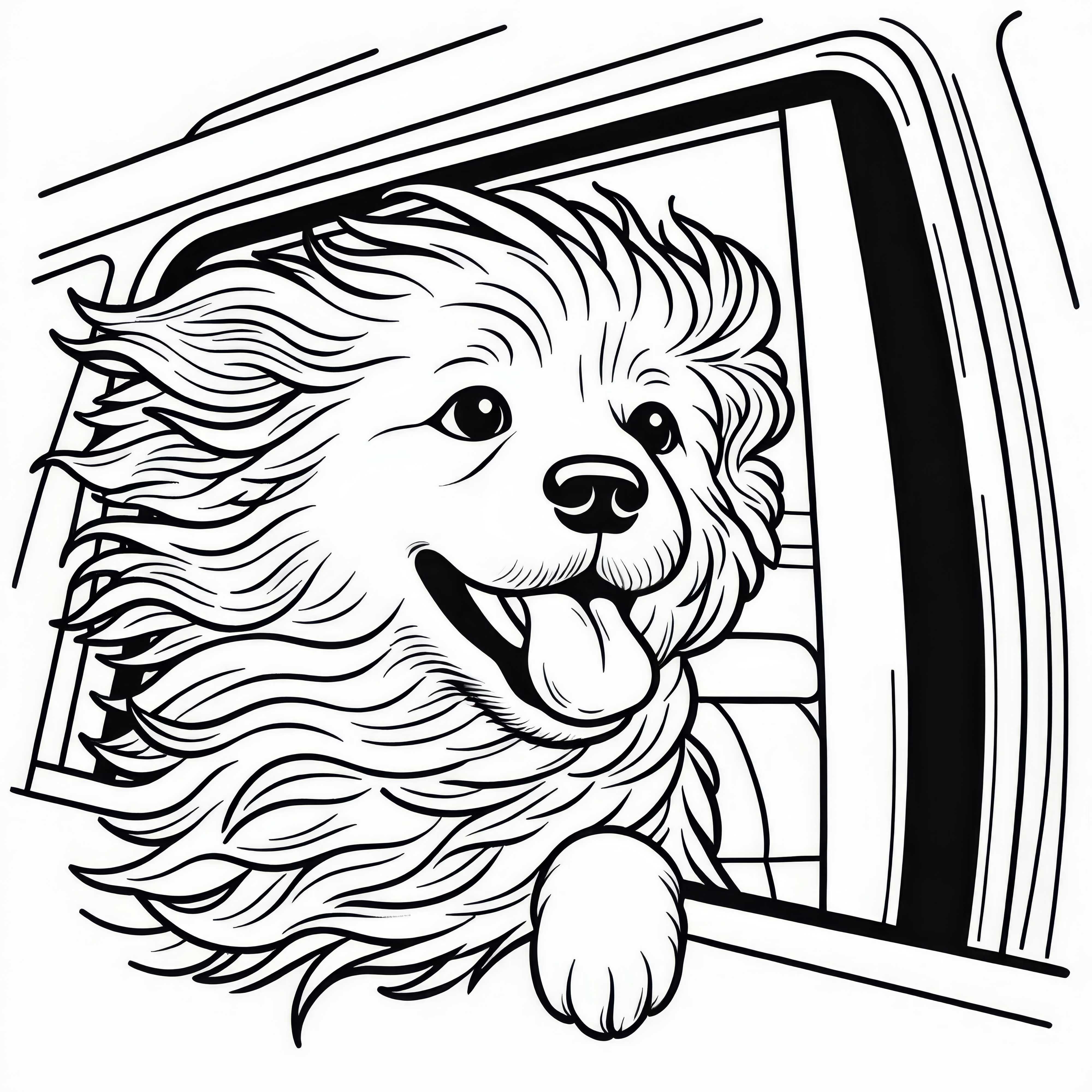 Cachorro olhando para fora da janela do carro com pelo esvoaçante no vento – Modelo de colorir gratuito