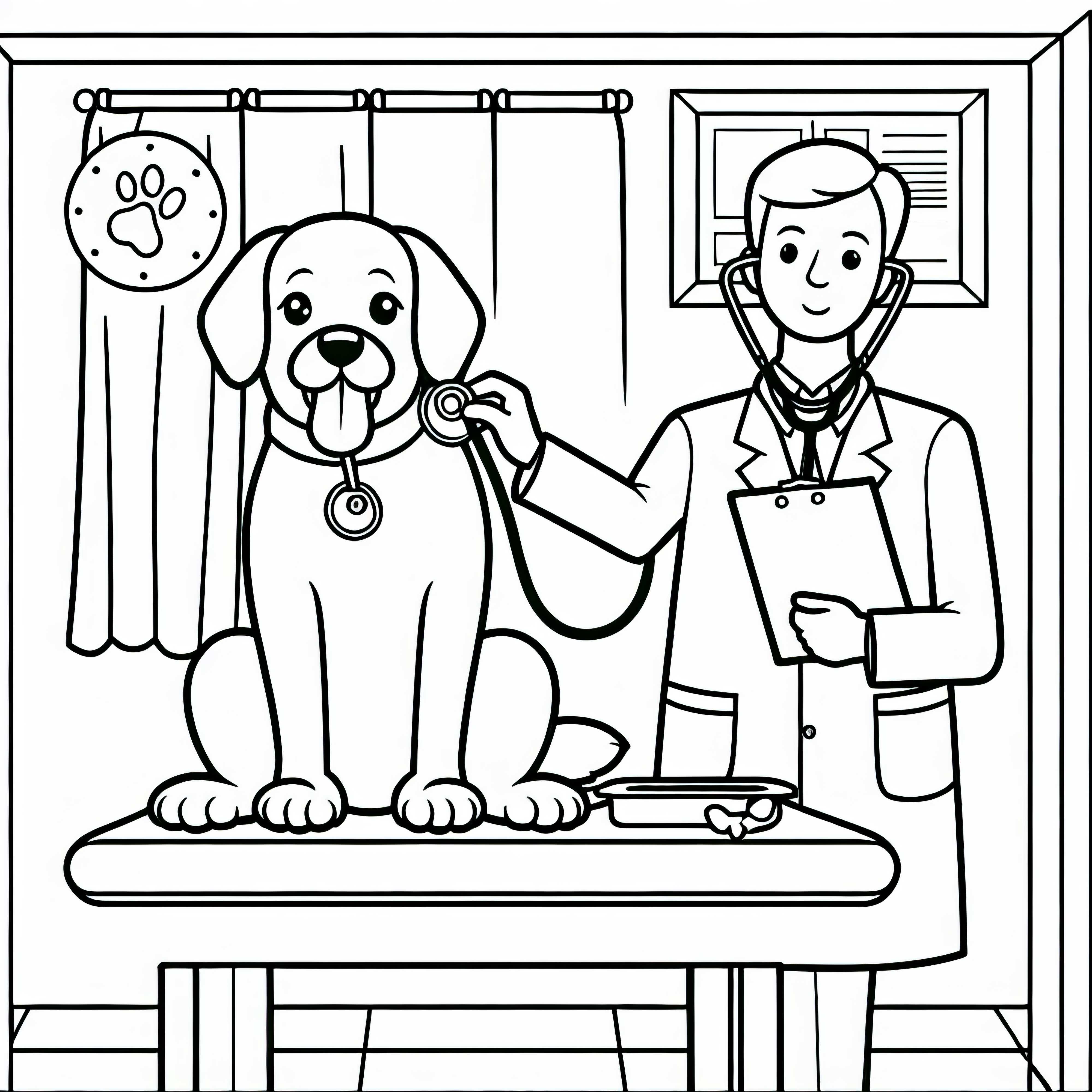 Cachorro no veterinário sentado pacientemente na mesa - Modelo para colorir gratuito