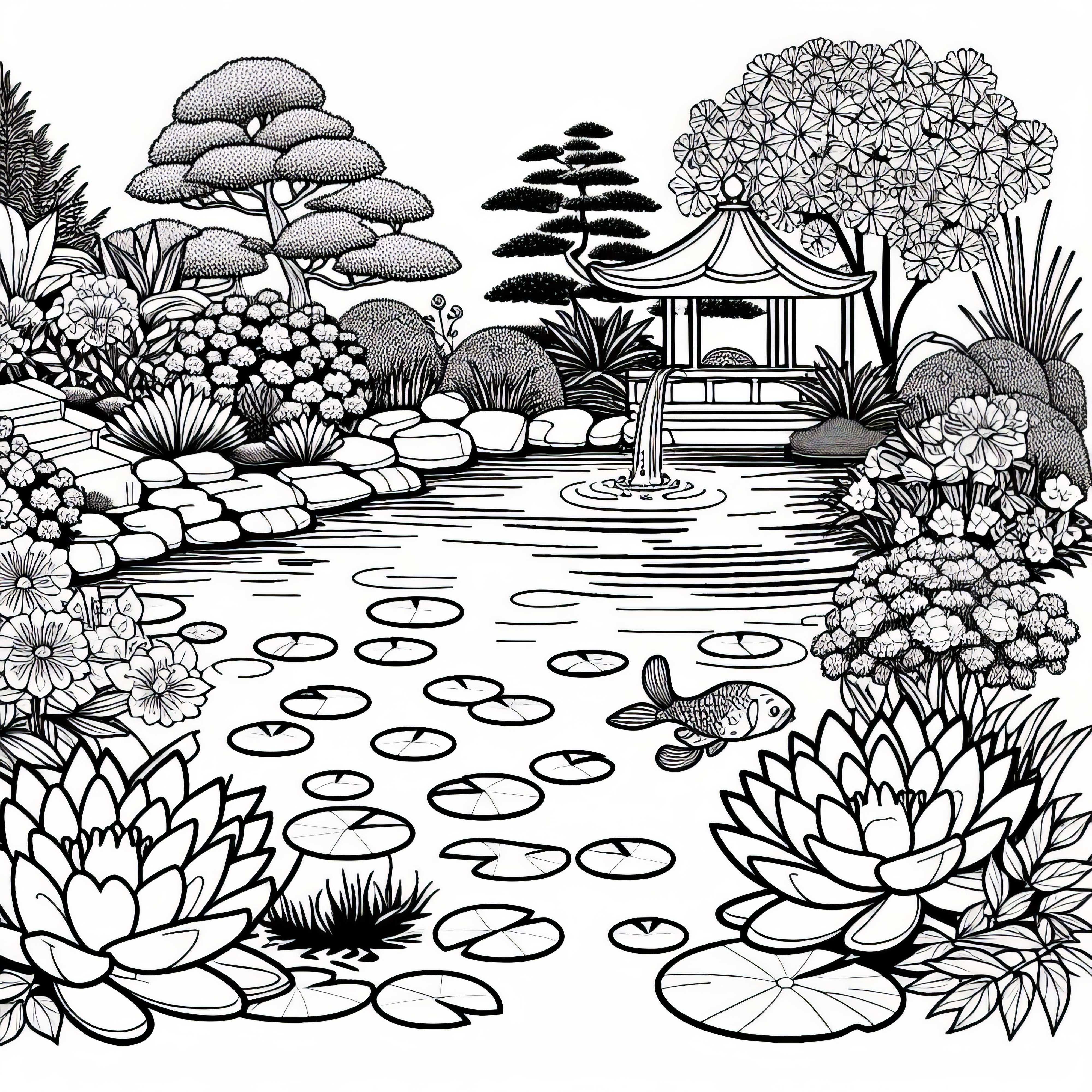 Ponte de madeira sobre um pequeno riacho no jardim - Desenho para colorir gratuito