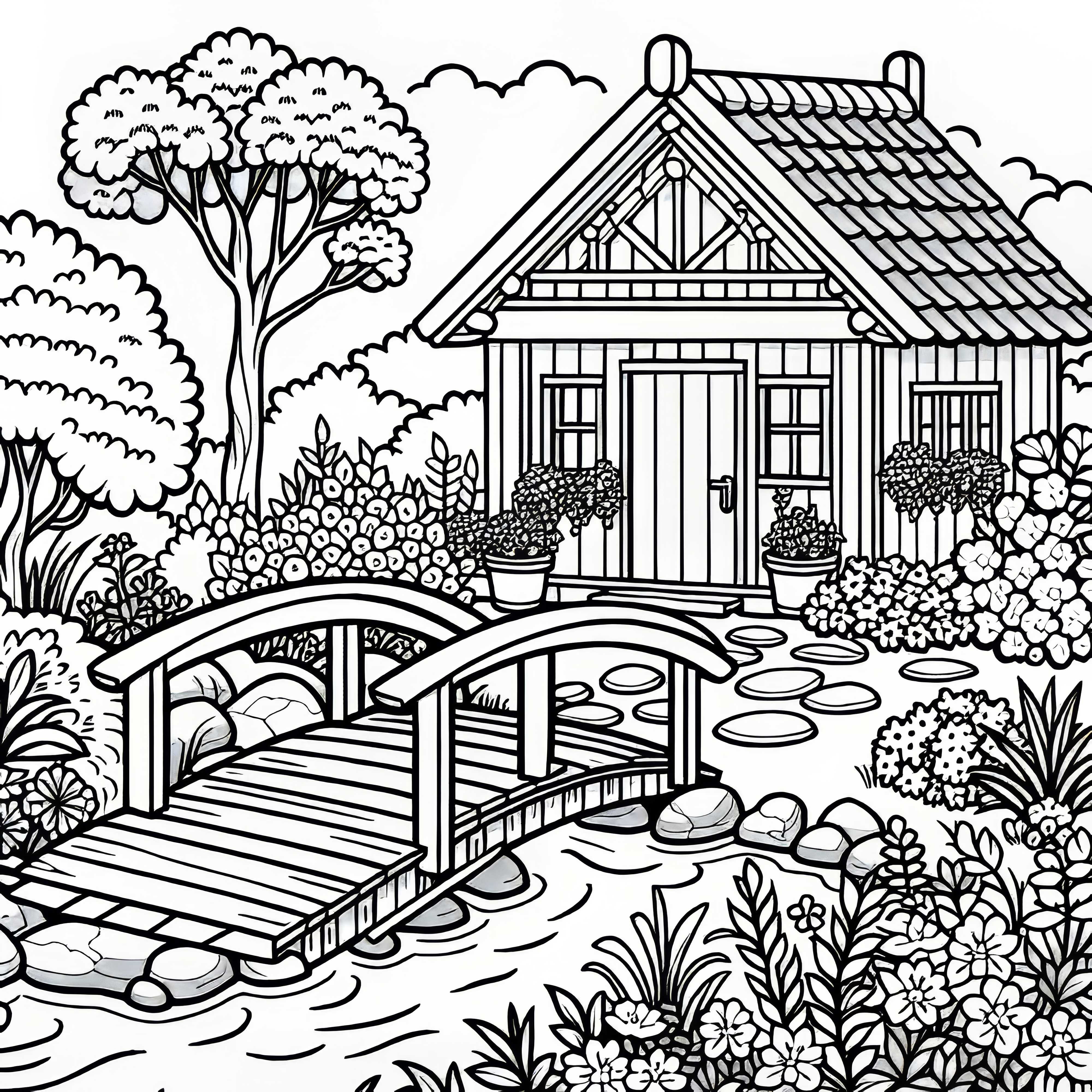Ponte de madeira sobre um pequeno riacho no jardim - Desenho para colorir gratuito