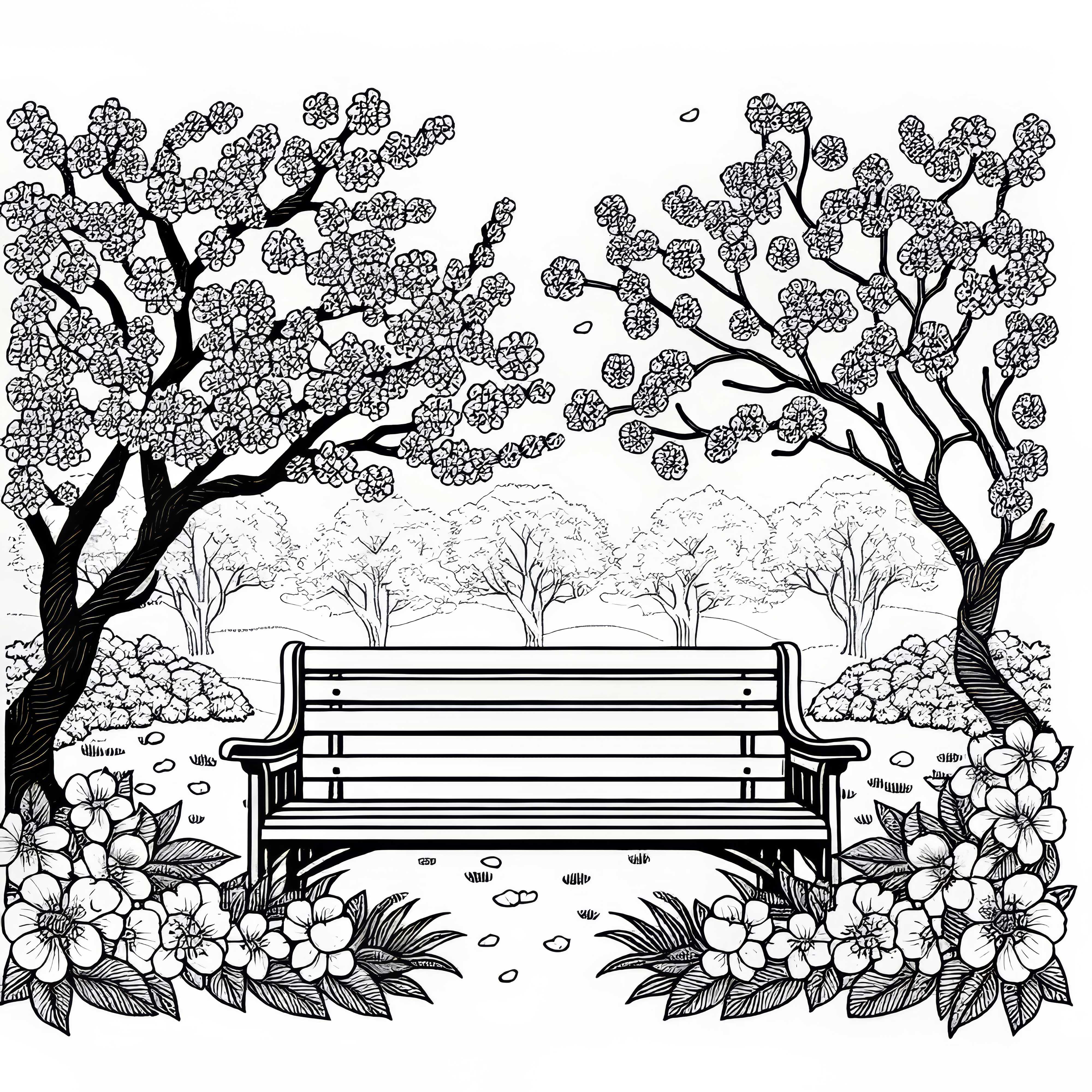 Imagem para colorir banco sob árvores de cerejeira em flor no jardim – Todos os detalhes de uma só vez