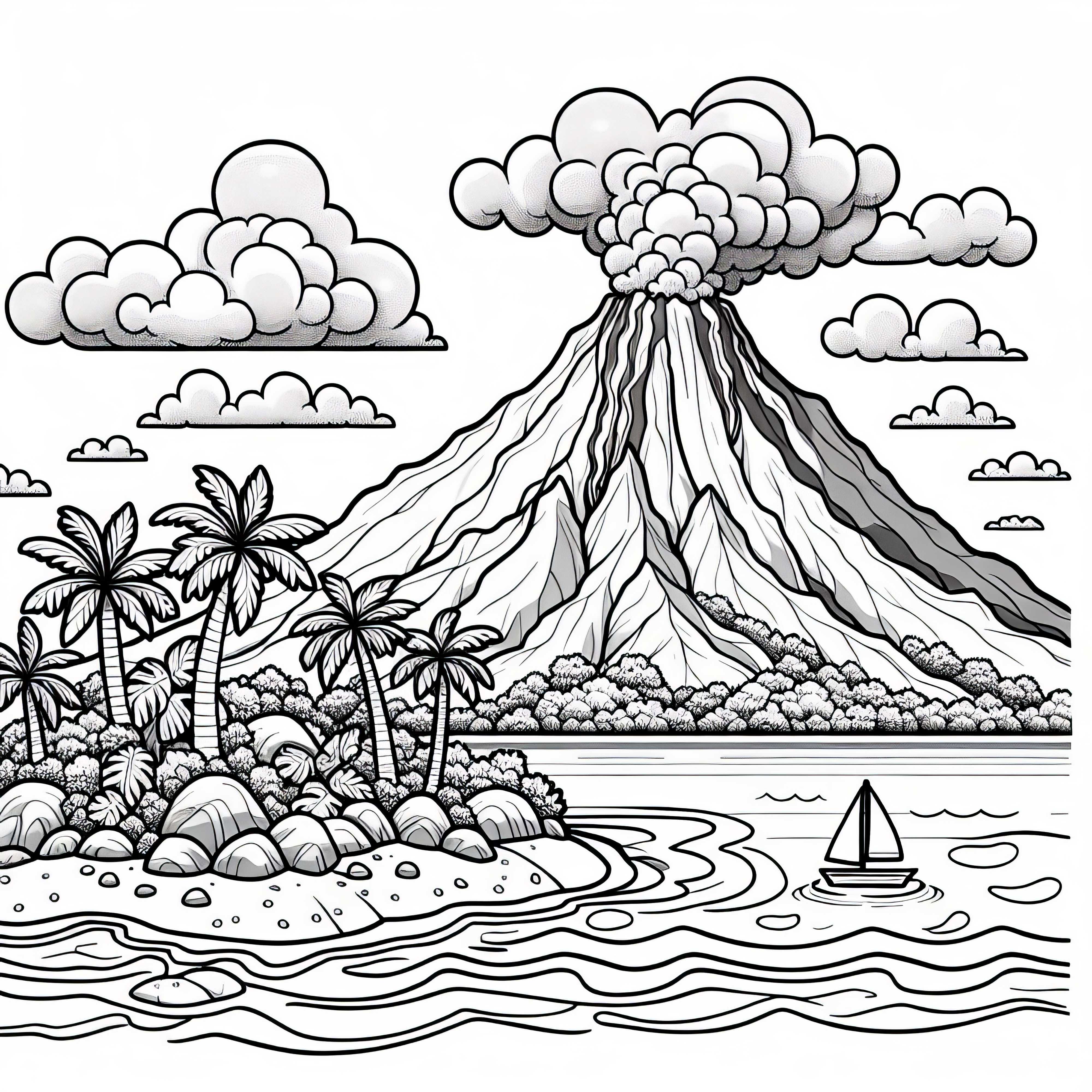Ilha tropical com vulcão ativo – Desenho para colorir gratuito