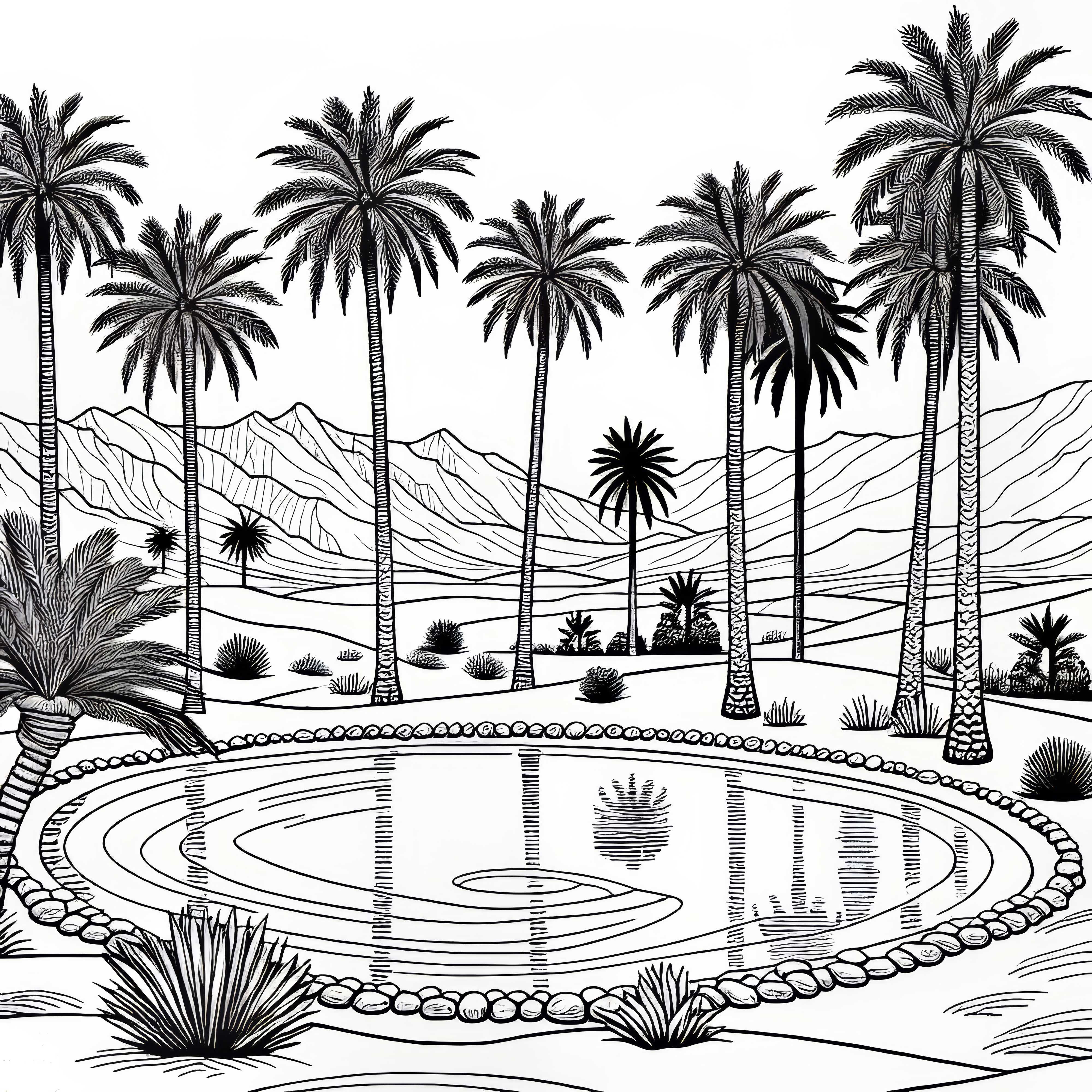 Visão geral do modelo de colorir "Oásis com palmeiras no deserto"