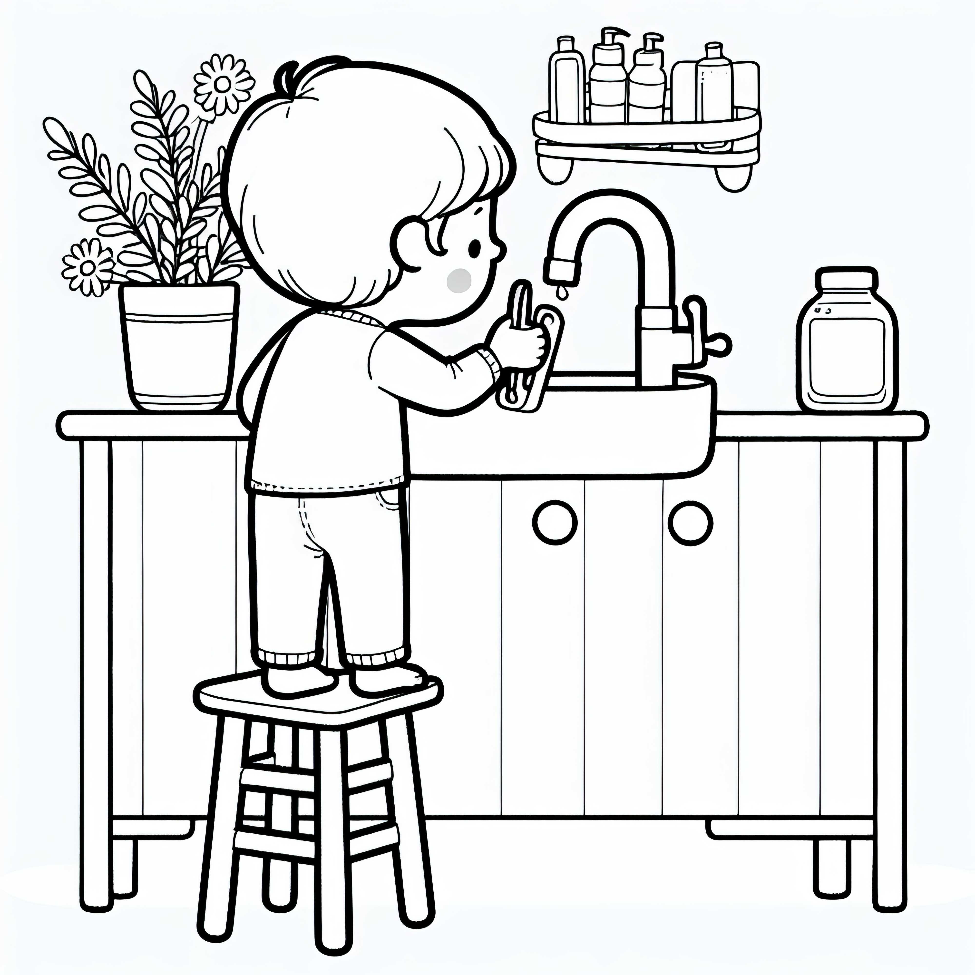 Duas crianças lavam o rosto na pia – Desenho para colorir grátis