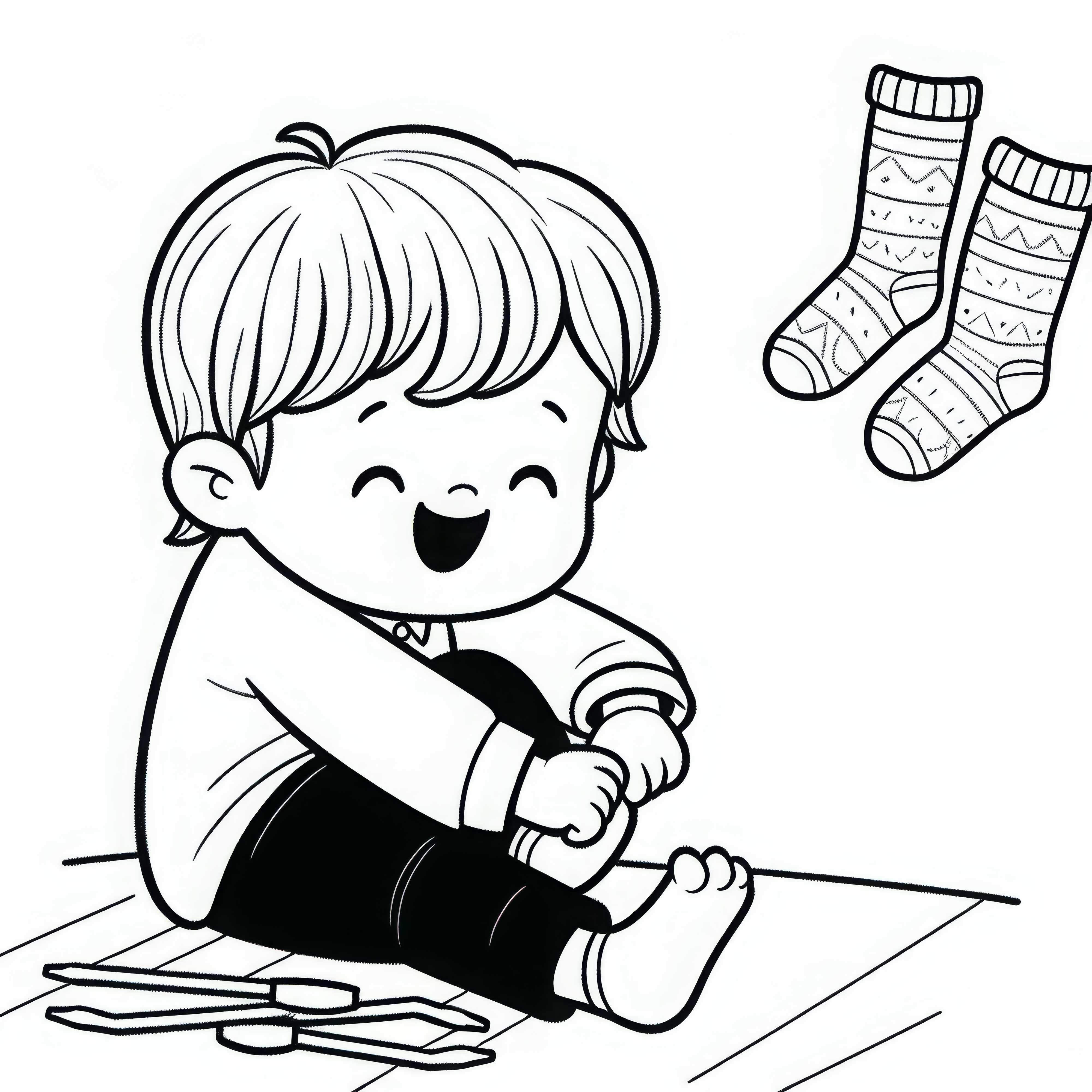 Criança coloca um suéter pela cabeça no quarto infantil – Desenho para colorir grátis