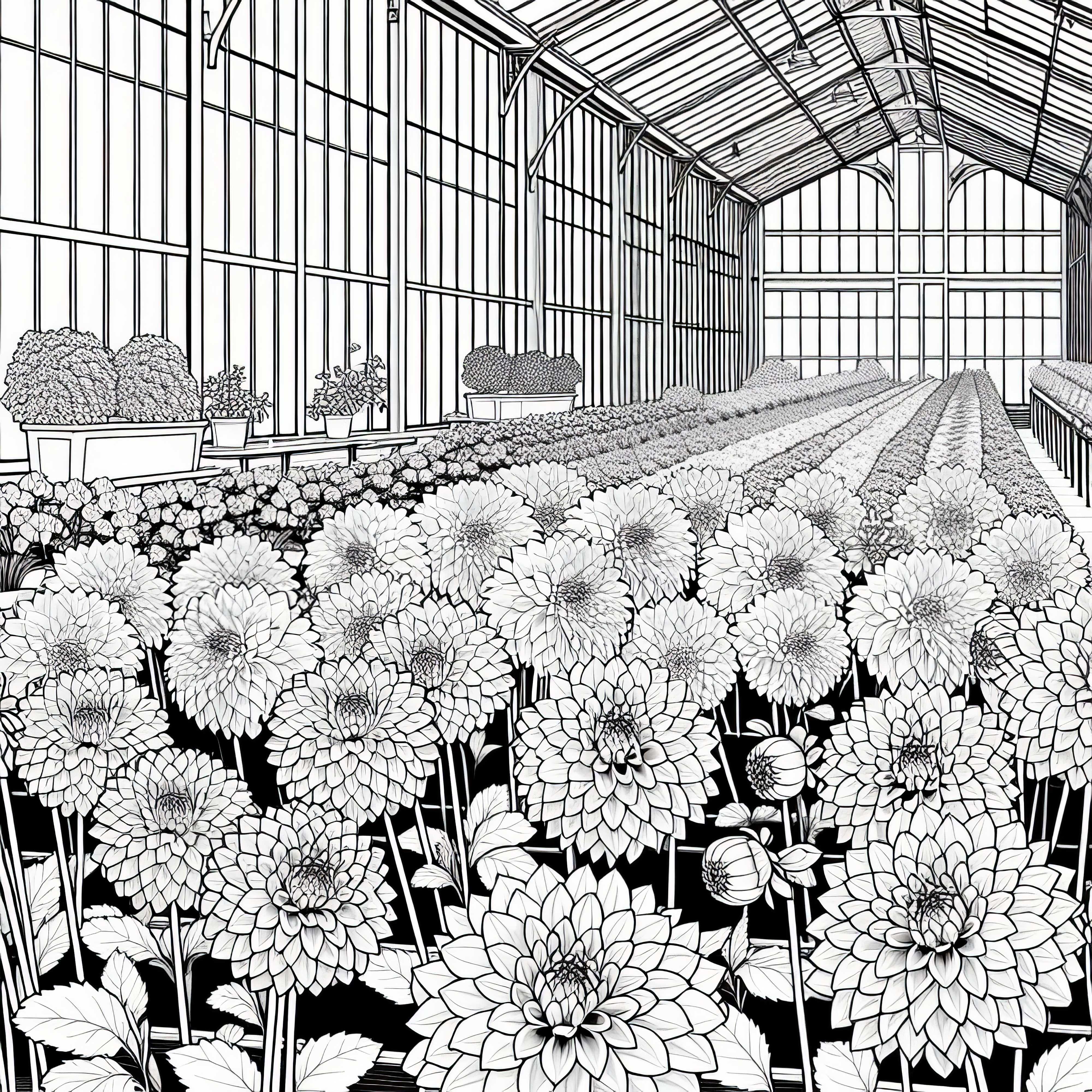Lindo desenho para colorir com várias dálias na estufa. Baixe a imagem agora!
