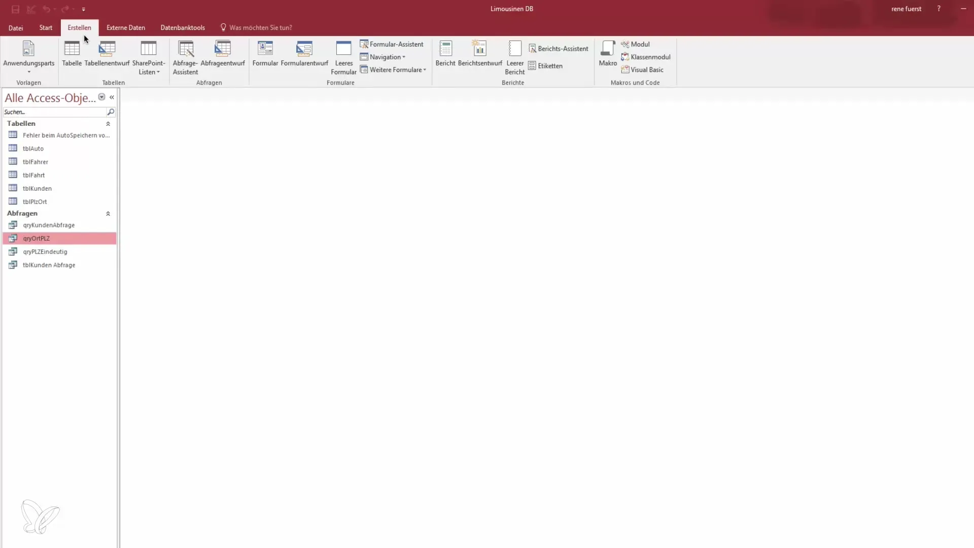 Primeiro, você precisa ter uma visão geral das funções dos relatórios no Access. Você encontrará suas tabelas e consultas em uma seleção, mas ainda não relatórios. Para criar um relatório, vá até o menu e selecione "Criar".