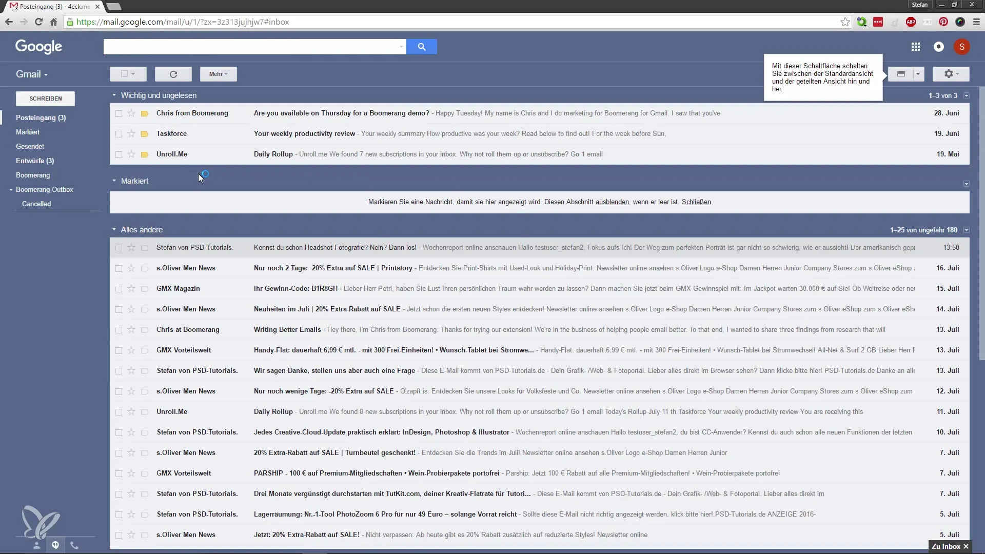 Após reiniciar o Gmail, você notará que um novo botão foi adicionado. Isso permite que você altere a visualização de seus e-mails. Você pode escolher uma divisão vertical aqui, que pessoalmente considero muito prática. Isso significa que você clica em um e-mail e o conteúdo é exibido imediatamente à direita, para que você possa passar rapidamente para o próximo assunto.