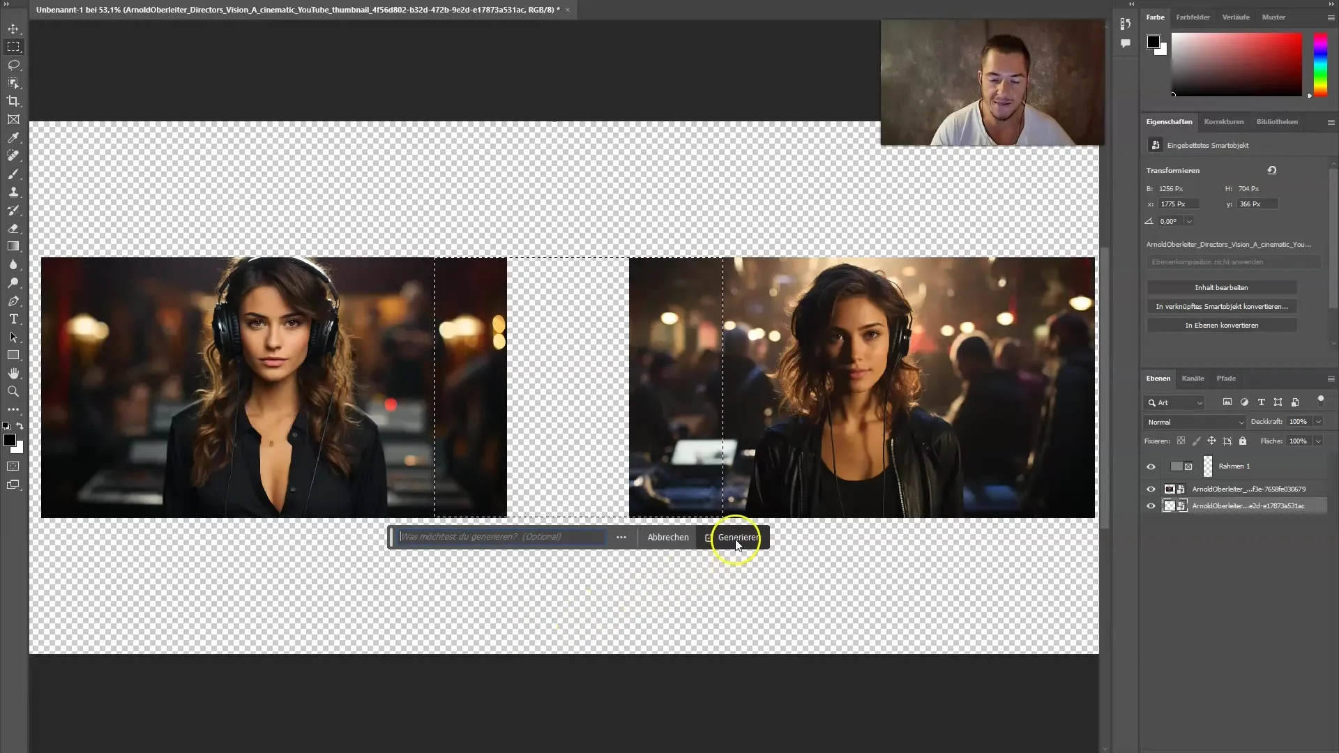 Para fundir as imagens, selecione o preenchimento generativo no menu. Neste ponto, certifique-se de que a seleção para o preenchimento à esquerda e à direita se estenda cerca de 15 a 30% em cada imagem.
