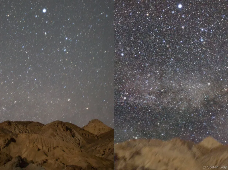 Com a câmera fixa e exposição longa, a paisagem fica nítida, mas as estrelas se tornam traços (à esquerda). Com o acompanhamento, ocorre o oposto: a paisagem fica desfocada e as estrelas nítidas (à direita). Além disso, mais estrelas são visíveis com o acompanhamento do que sem ele.