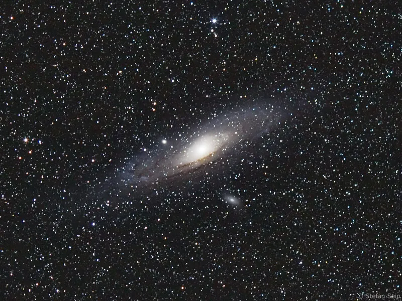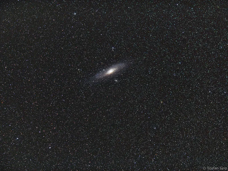 A galáxia de Andrômeda foi registrada com uma lente de 135 mm a f/2,8 (fechada 1 ponto). A exposição foi de 3 minutos a ISO 1000, com a montagem "AstroTrack 320x" assegurando o acompanhamento.
