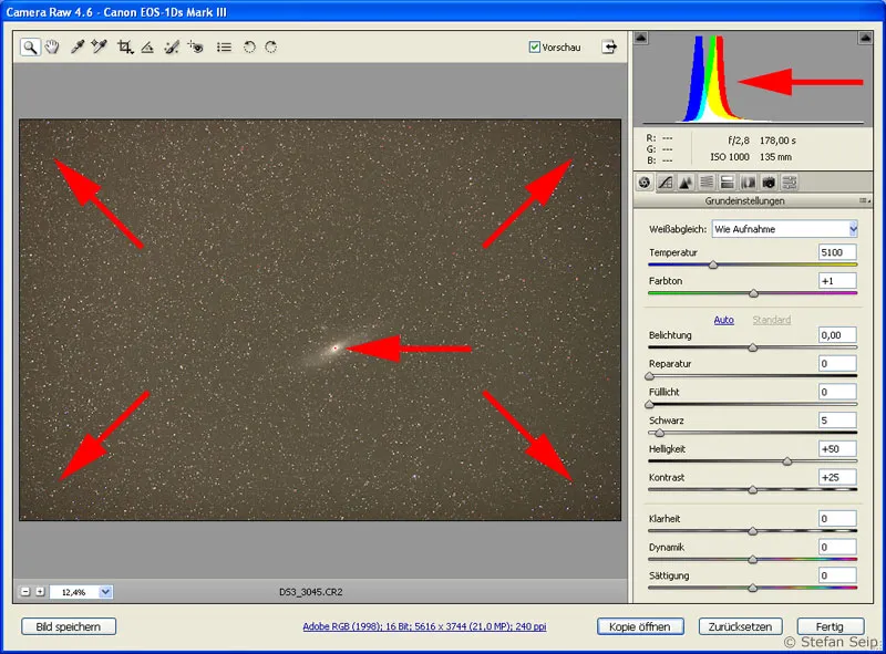 Ainda na tela inicial do "Camera Raw", identifico os problemas a resolver: os cantos escuros da imagem (quatro setas), o céu de fundo não neutro e cinzento (seta acima à direita do histograma) e o centro um pouco sobrexposto da galáxia (mancha vermelha, seta no centro da imagem).