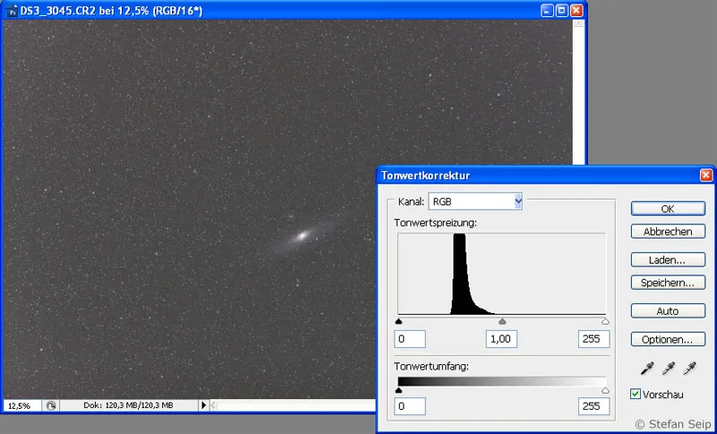 Movo o Ponto Preto (triângulo preto, seta esquerda) para a direita para cortar o histograma. O céu naturalmente escurece depois disso. Mas também ajusto o Ponto Cinza (triângulo cinza, seta direita) e o movo para a esquerda, de modo que a galáxia e as estrelas sejam exibidas mais brilhantes.