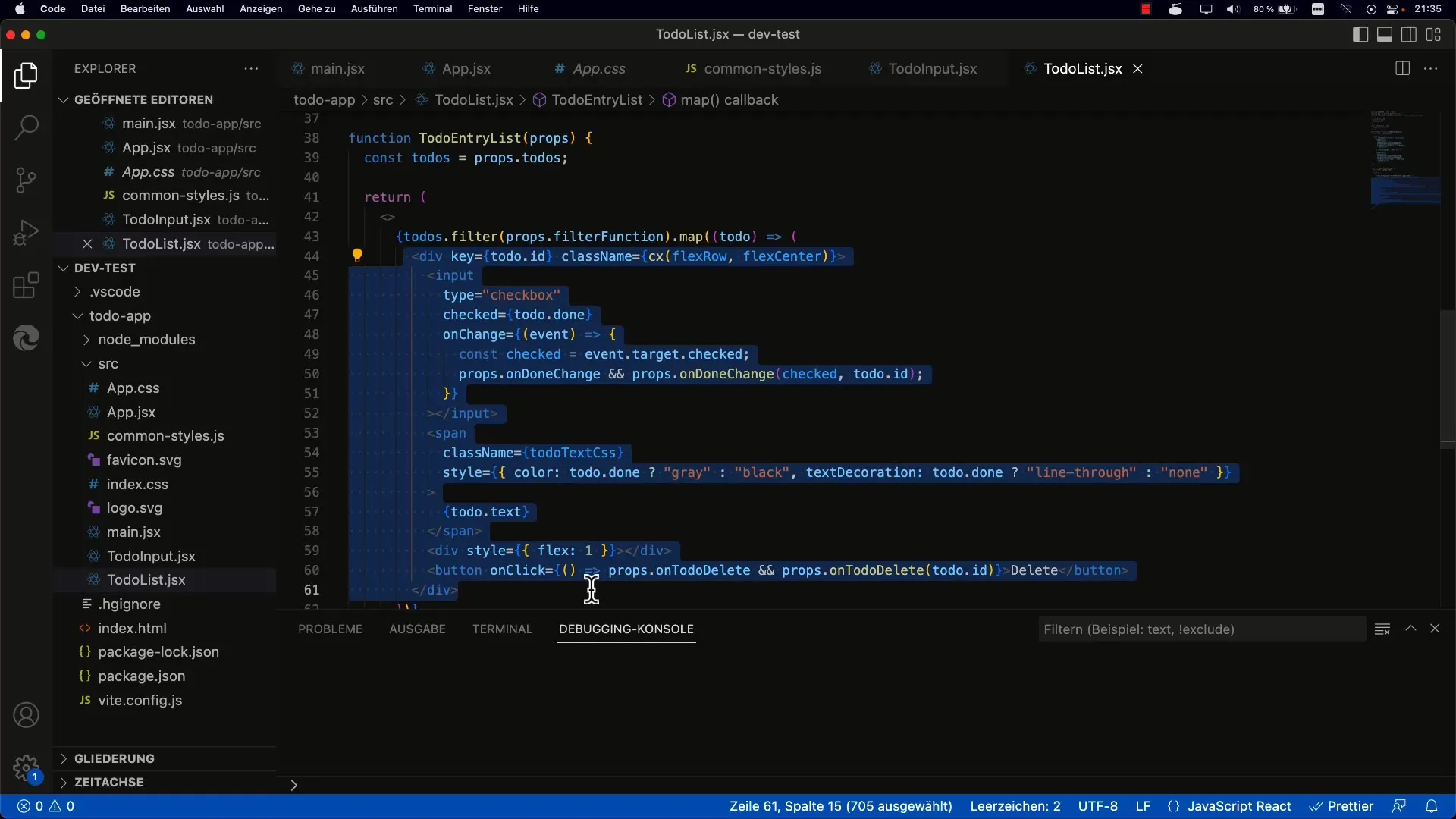 Quando olha para a forma como apresentou a sua lista e as tarefas individuais, apercebe-se de que poderia mover alguns dos itens da lista para componentes separados. Desta forma, pode manter o código mais limpo e melhorar a reutilização dos componentes.