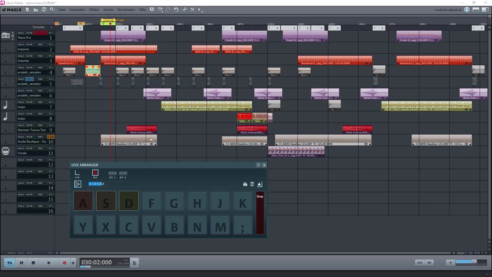 Depois de marcar e atribuir as áreas desejadas, você pode reproduzir seu projeto. Use as teclas definidas (A, S, D etc.) para alternar entre os loops salvos e testar como eles soam juntos.