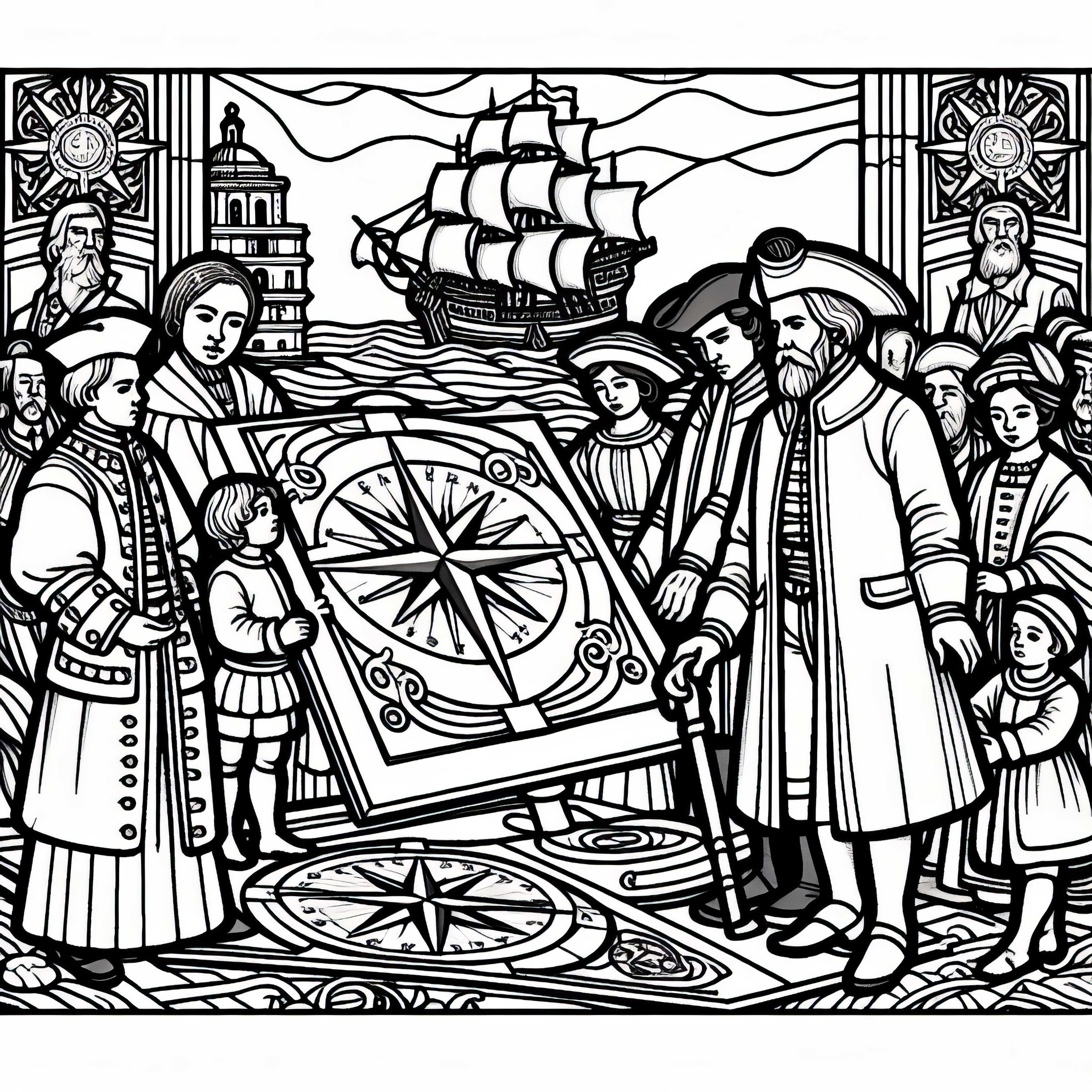 Hărțile marine din epoca de aur erau lucrări sofisticate, utilizate pentru navigația pe mările lumii. În special, Spania a jucat un rol central în descoperirea și dezvoltarea de noi rute comerciale și colonii. Roza vânturilor este un element esențial al hărților, care îi ajuta pe navigatori să se orienteze pe ape. Aceste rozete indică cele patru puncte cardinale, dar și adesea puncte suplimentare. Hărțile marine create de cartografii spanioli sunt adesea reprezentări artistice, care îndeplineau atât utilizări practice, cât și cerințe estetice. Ilustrațiile colorate și modelele ornamentale erau frecvente. Deci, epoca de aur a fost nu doar o epocă a descoperirilor, ci și a reprezentării artistice a lumii. Dacă cauți mai multe imagini de colorat legate de epoca de aur a Spaniolui, le poți găsi sub alte imagini de colorat din epoca de aur a Spaniolui.