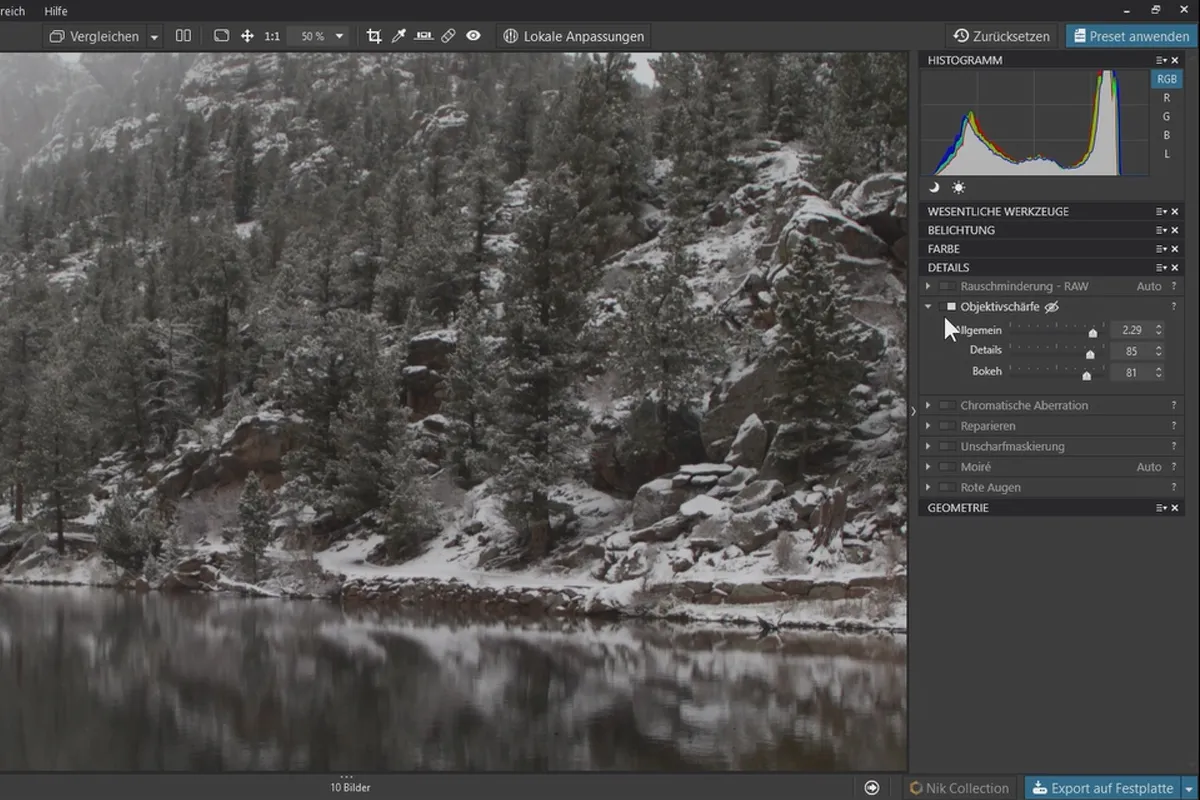 În părțile ulterioare ale tutorialului, vei vedea, explicate în lecții practice, ce posibilități de corectare foto ai la dispoziție și cum procedezi. Fie că este vorba de corectarea expunerii, histograma sau echilibrul alb, de reducerea zgomotului, aberația cromatică sau distorsiune – învață ce presupun acestea și alte filtre și cum le aplici concret. În concluzie, te vei capacita să ajustezi fotografiile chiar și local, respectiv în zonele selectate de tine.