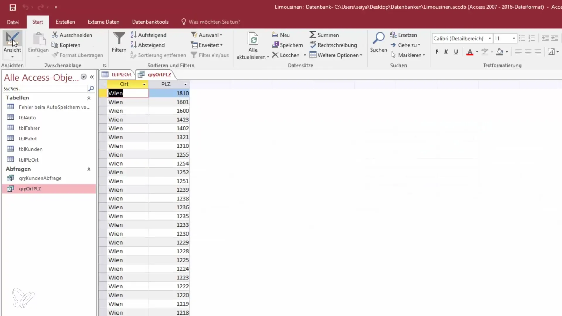 Salvează interogarea și treci la vizualizare. Acum vei fi întrebat să introduci un cod poștal. Încearcă, de exemplu, codul poștal „1402” pentru Viena și confirmă introducerea.