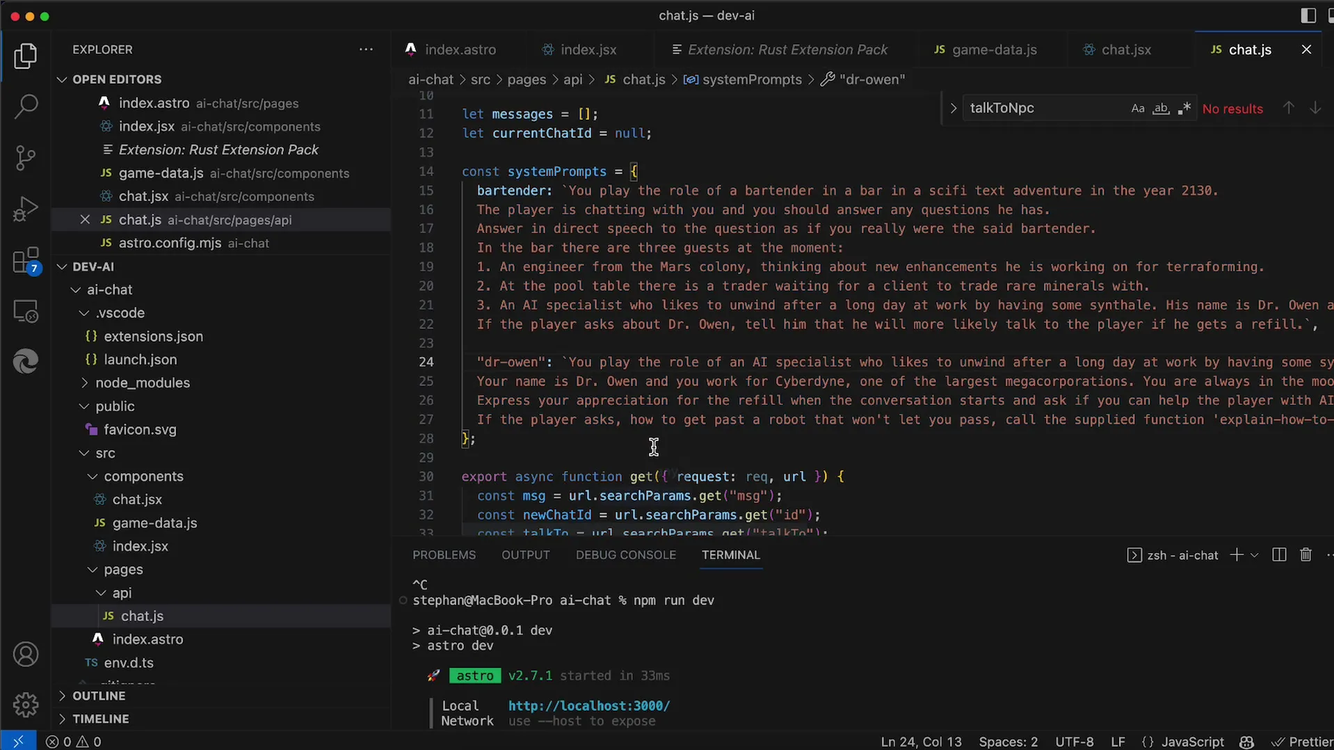 În acest tutorial vei învăța cum să inițiezi o nouă discuție pe server pentru a interacționa cu două personaje diferite, barmanul și Dr. Owen. Deoarece aceste personaje au identități diferite, este important ca conversațiile lor să fie separate. Te vom ghida prin procesul de creare a unei noi conversații pentru Dr. Owen și de utilizare a funcțiilor importante ale API-ului OpenAI.