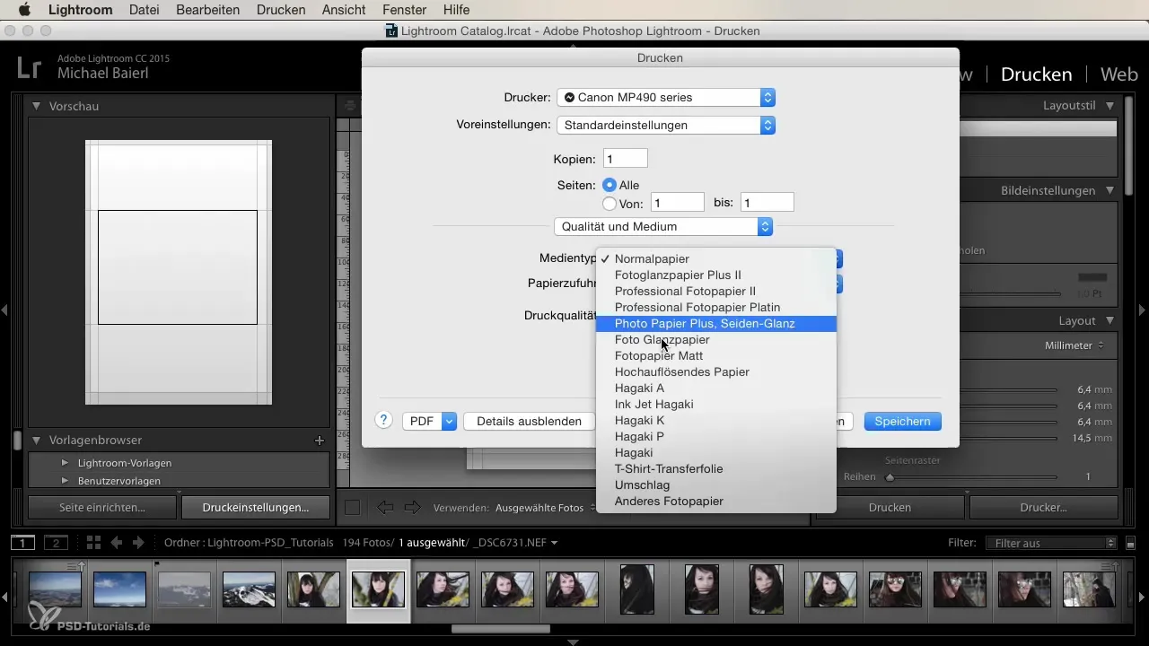 Acum vine vorba de setările calitative. Poți face ajustări de culoare și stabili calitatea, precum și suportul. Asigură-te că alegi tipul de hârtie corect, cum ar fi hârtia foto mată. La calitatea imprimării, este recomandat să alegi o calitate înaltă pentru ca imaginile tale să strălucească în cea mai bună lumină.
