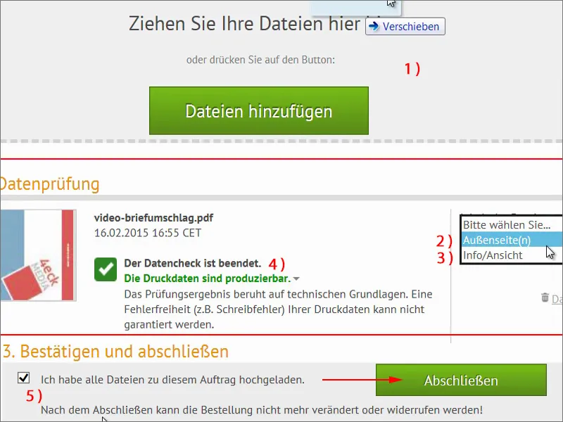 Acum trag fișierele prin metoda drag-and-drop în această zonă (1). Acum vedem aici iar Previzualizare, o previzualizare. „Vă rugăm să selectați un scop de utilizare”. Acesta este partea exterioară (2). Uneori este foarte important să trimiteți și fișiere de informare sau vizualizare, de exemplu (3). Aici primim încă o verificare scurtă (4) – lumină verde: „Datele pentru tipărit sunt producțibile”. Perfect. O altă verificare la „Am încărcat toate fișierele aferente acestei comenzi” (5) și apoi mergem la Finalizare.
