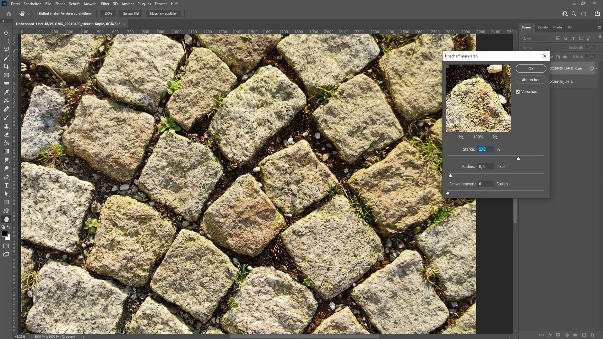 Poți crește intensitatea efectului ajustând valoarea „Intensitate”. Pentru această imagine, o intensitate de 170% ar fi potrivită. Dar fii atent - valori prea mari fac imaginea să pară nenuțită.