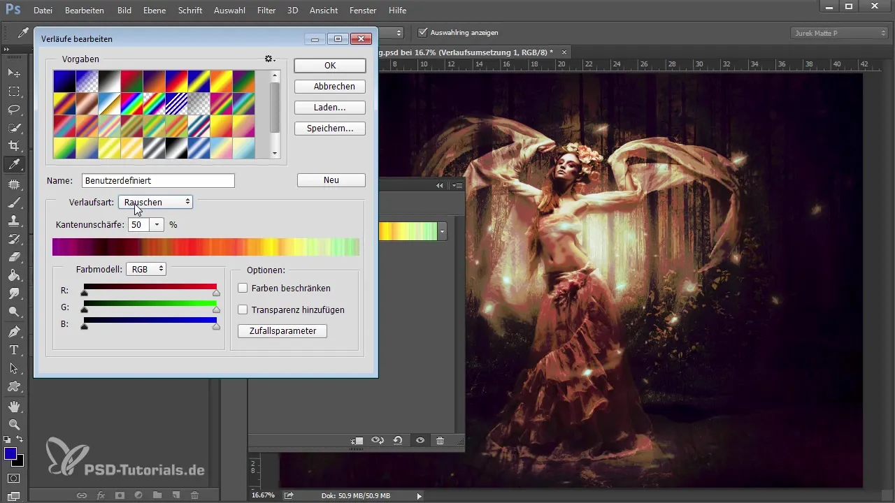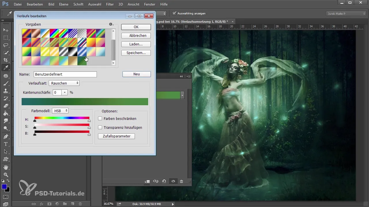 Un alt aspect interesant al transformării gradientului este experimentarea cu modelul de culoare. Aici poți trece de la RGB la HSB și ajusta nuanțele, saturația și luminozitatea. Adăugarea zgomotului poate, de asemenea, să genereze efecte interesante.