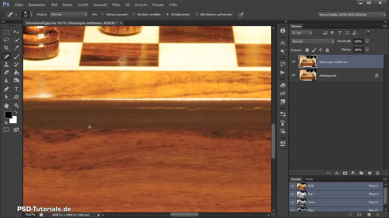 Eliminarea imaginii și corectarea imaginilor pot contribui decisiv la aspectul atractiv al unui compus. În acest tutorial, te vei concentra pe tabla de șah, care a fost fotografiată în condiții suboptime. În această secțiune, îți vom arăta cum să eliberezi tabla de șah de fundal, să elimini elementele deranjante și să faci ajustări de culoare pentru a o pregăti pentru proiectul tău creativ.
