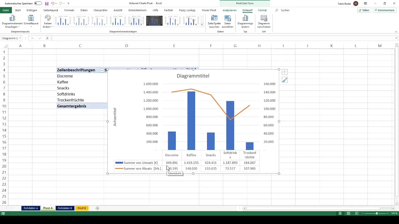 Acum poți stiliza diagrama după preferințele tale. Poți muta legenda, schimba schemele de culori și ajusta formatarea. În bara de design, ai la dispoziție diferite aspecte pe care le poți folosi pentru a face diagrama ta atrăgătoare.