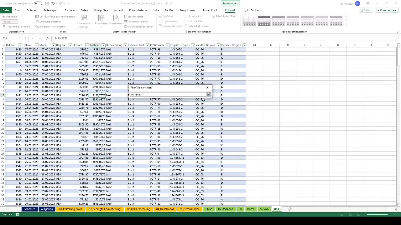 Pentru a crea rapoarte detaliate pentru fiecare țară, este suficient să dai dublu clic pe valorile de vânzări din tabela pivot. Astfel vei deschide o vedere detaliată, în care sunt listate toate informațiile relevante, inclusiv vânzări, costuri și alte dimensiuni. Poți redenumi rapoartele individuale pentru a crește claritatea.