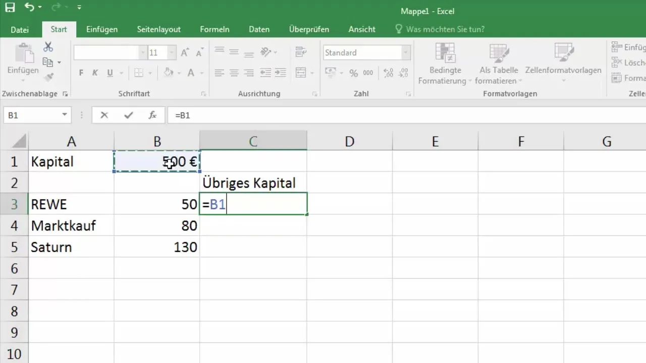 Acum vrem să calculăm capitalul rămas după fiecare cumpărătură. Într-o celulă nouă poți introduce formula pentru a calcula capitalul rămas după cumpărarea de la Rewe. Formula ar fi =B1-B3, unde B1 reprezintă capitalul inițial și B3 suma cheltuită la Rewe.