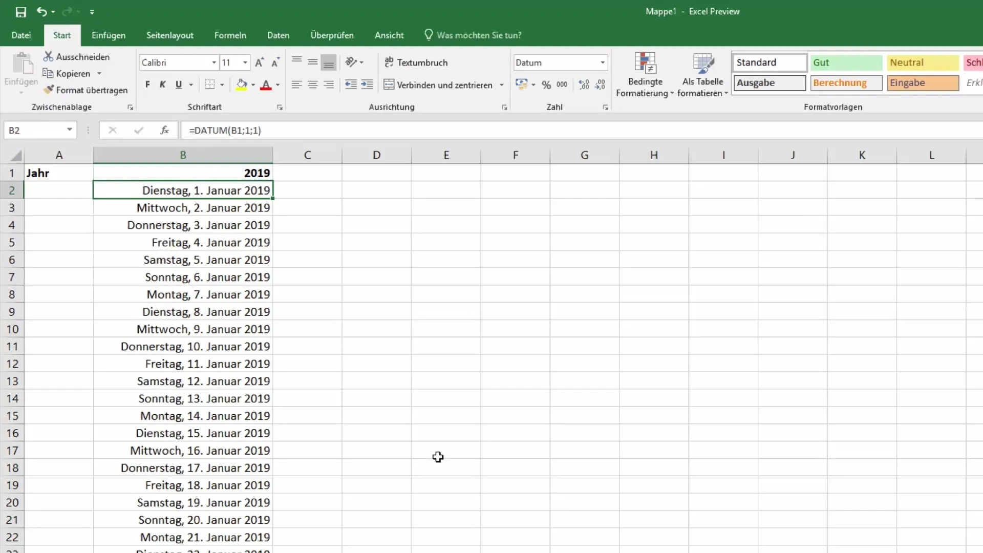 Pentru crearea calendarului, vom folosi funcția de dată din Excel. În celula B2, introdu funcția „=DATUM(B1;1;1)”. Aici, B1 reprezintă anul pe care l-ai introdus anterior. Funcția generează prima zi a anului.