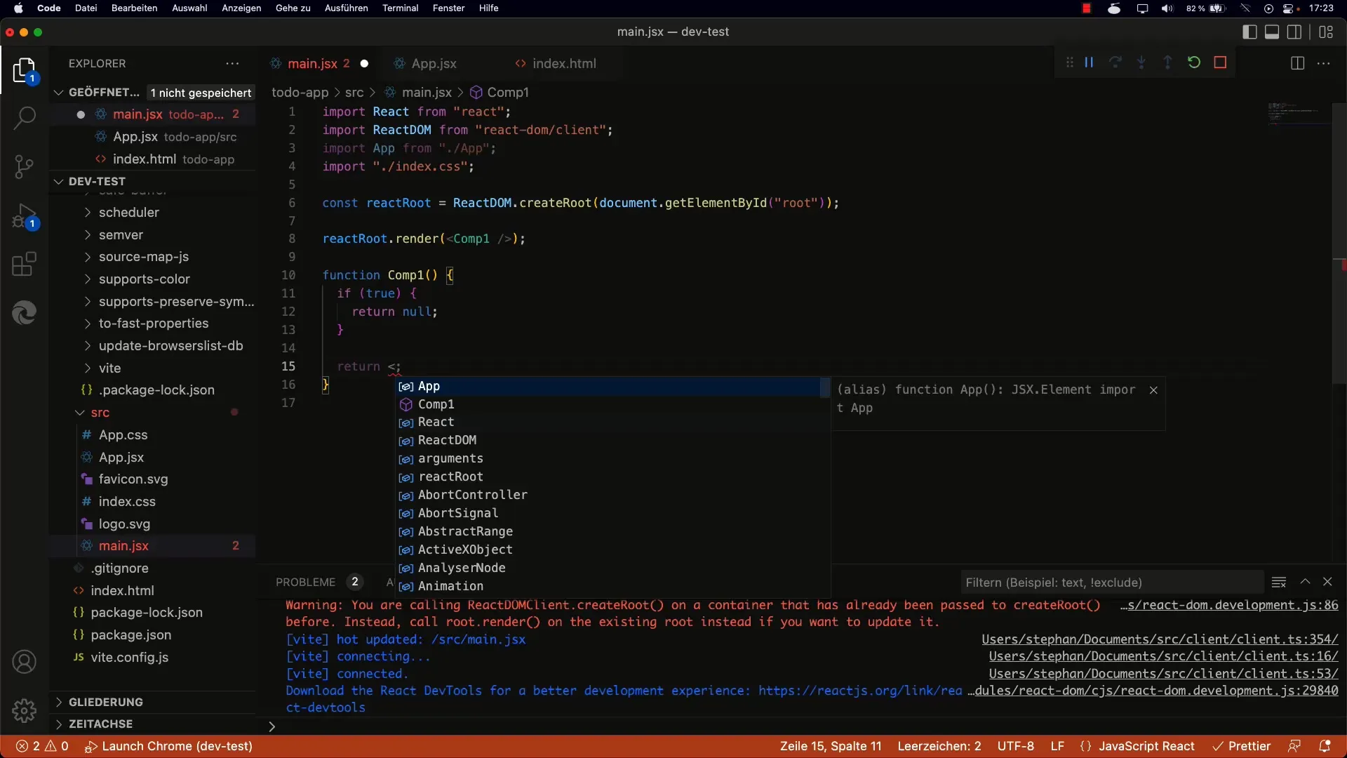 Pentru a îmbunătăți structura codului tău, ar trebui să muți componenta Comp1 într-un fișier nou numit Comp1.jsx. Acest lucru face codul să fie mai clar și previne erorile potențiale datorate unor rădăcini multiple.
