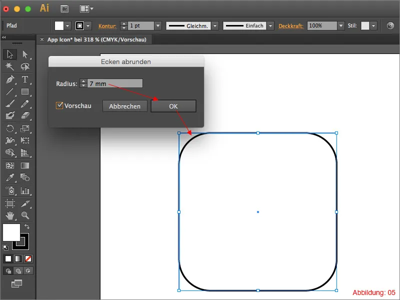În fereastra care apare, introduceți un rază a colțului de 7 mm. Confirmați totul cu OK.