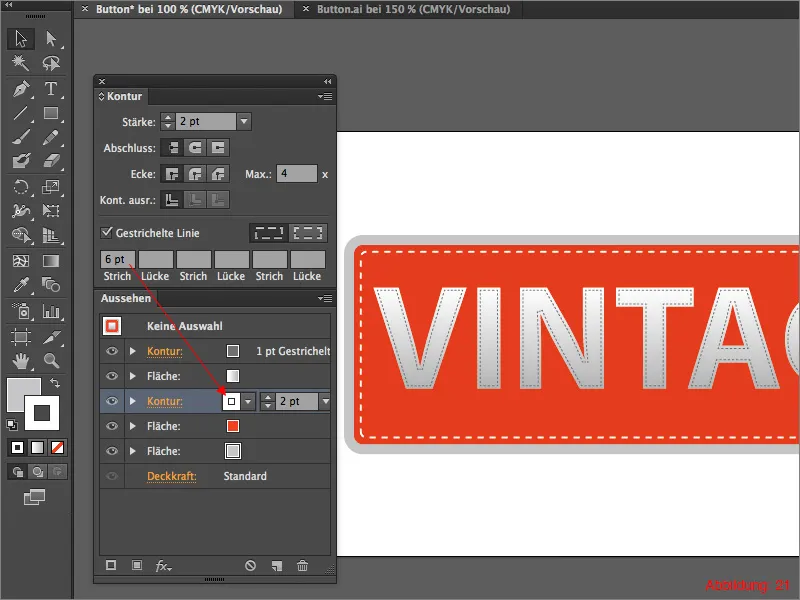 În următorul pas, urmează să integrați din nou o cusătură sau linie punctată în zona roșie. Pentru aceasta, mergeți ca de obicei în Panoul de Aspect și creați acum deasupra zonei roșii un nou contur (din nou printr-un mic buton din colțul inferior stânga al Panoului de Aspect).