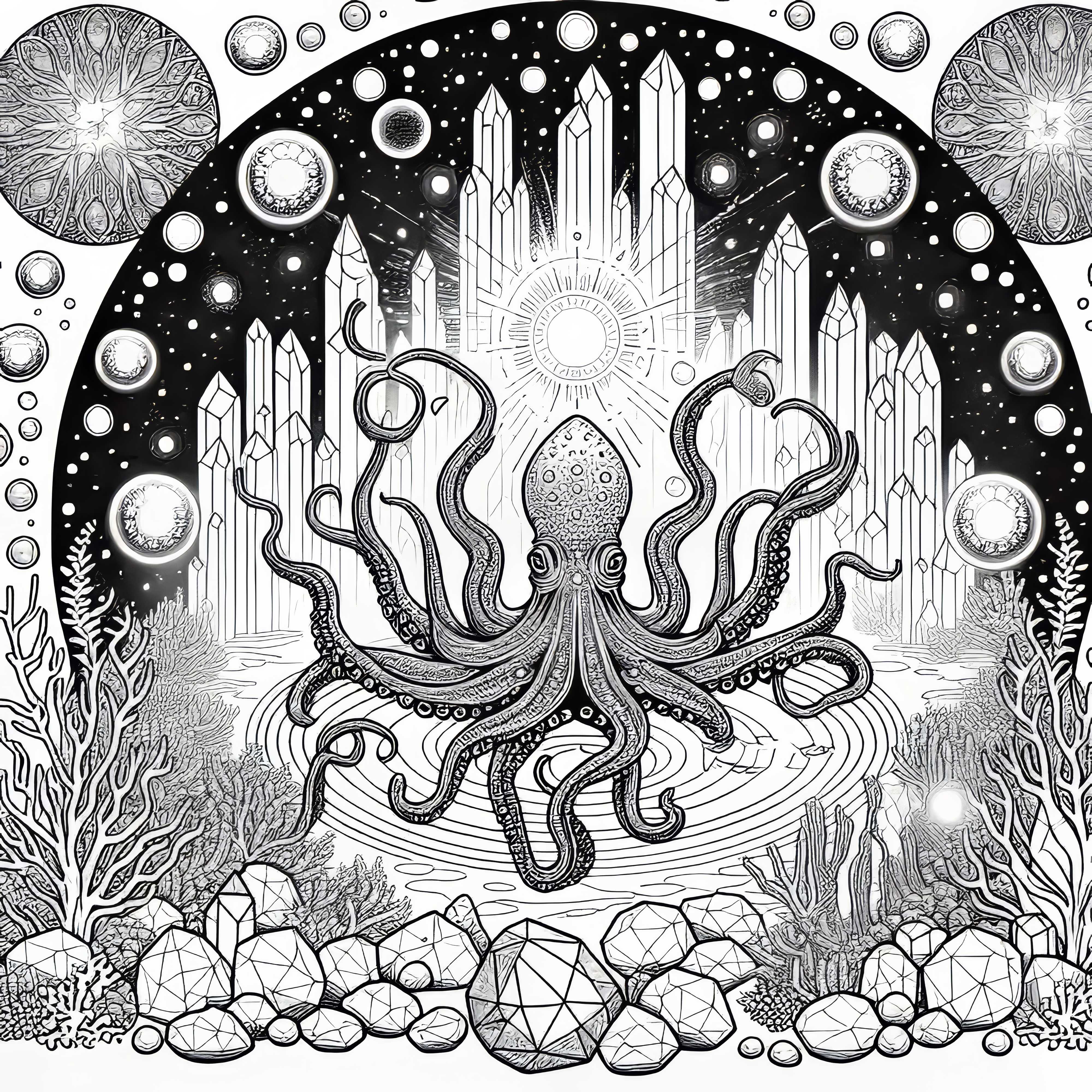 Подводный город с орденом осьминога, который возвышается в круге из светящихся кристаллов – раскраска бесплатно