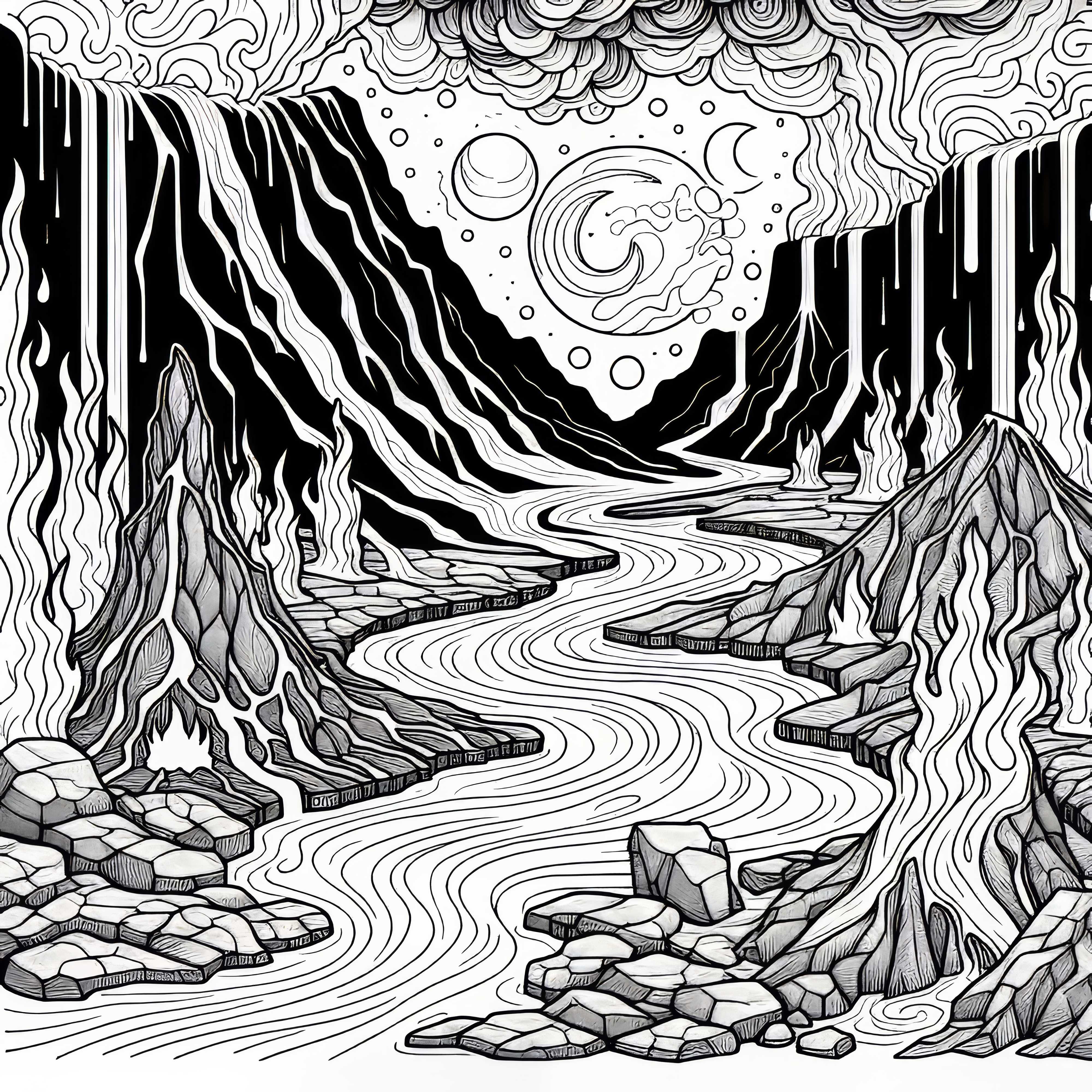 Вулканический пейзаж с магмовыми бабочками над скальной трещиной – бесплатная раскраска