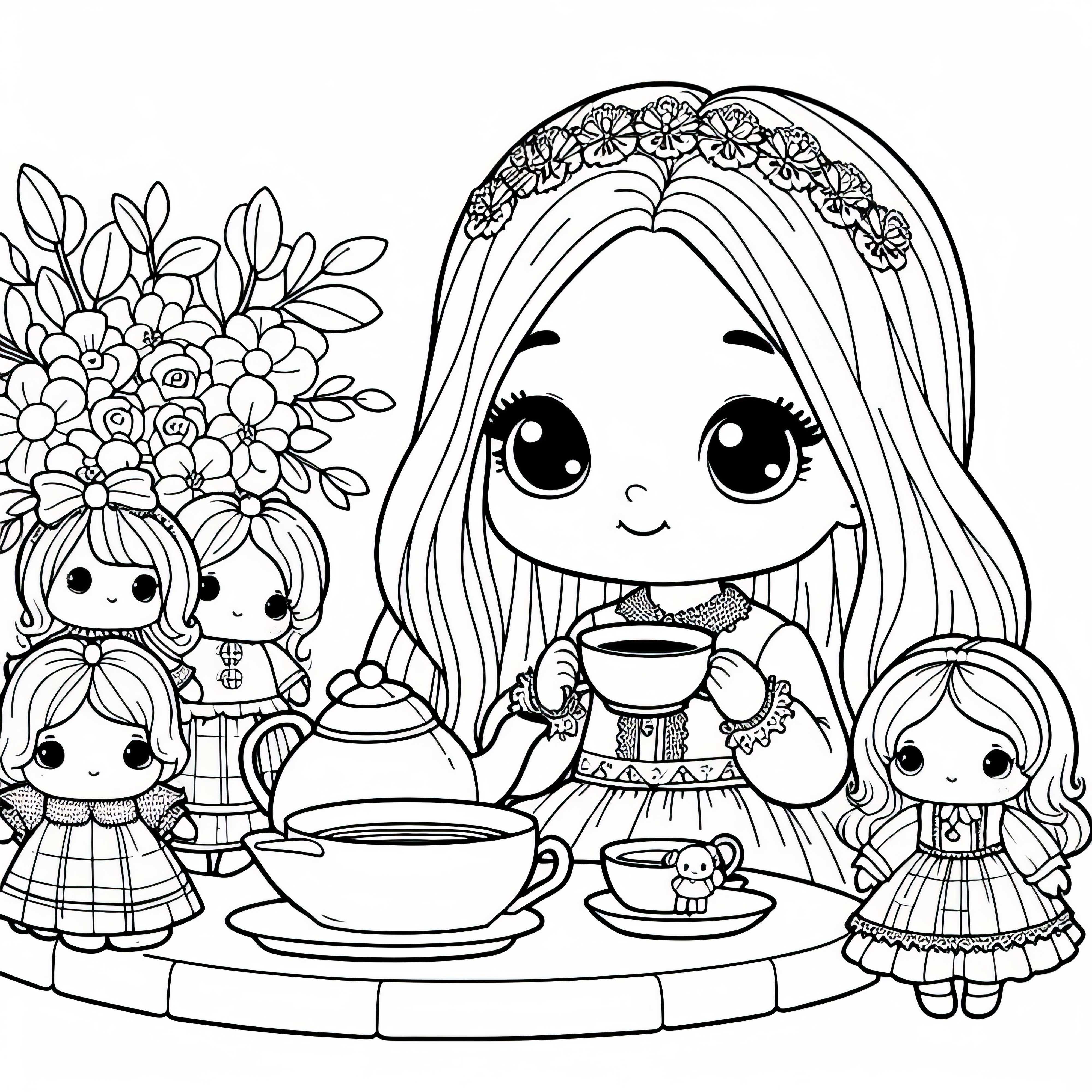 Куклы уютно сидят вокруг маленького стола и празднуют день рождения – бесплатная раскраска