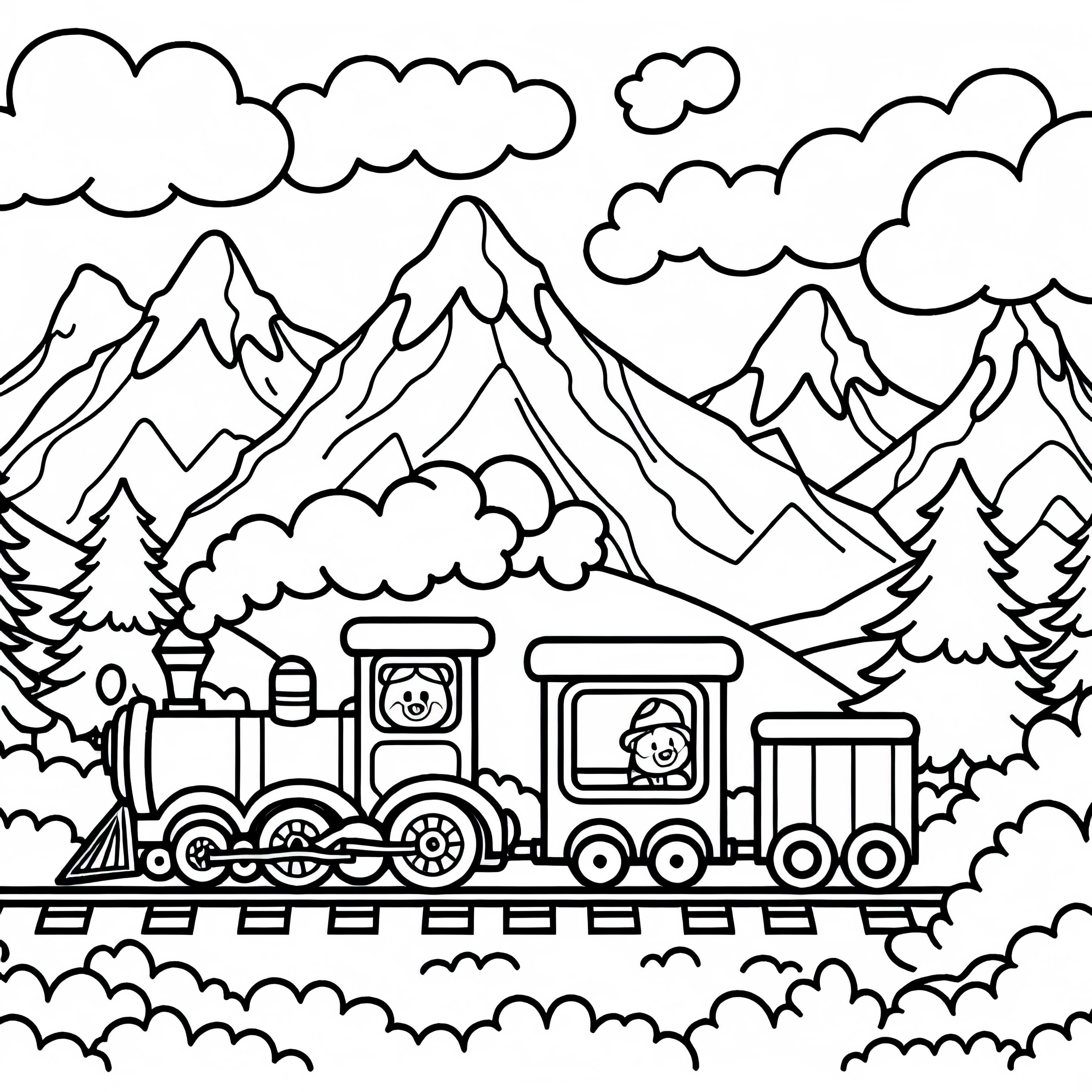 Игрушечная железная дорога проходит через горный ландшафт – раскраска доступна для бесплатной загрузки