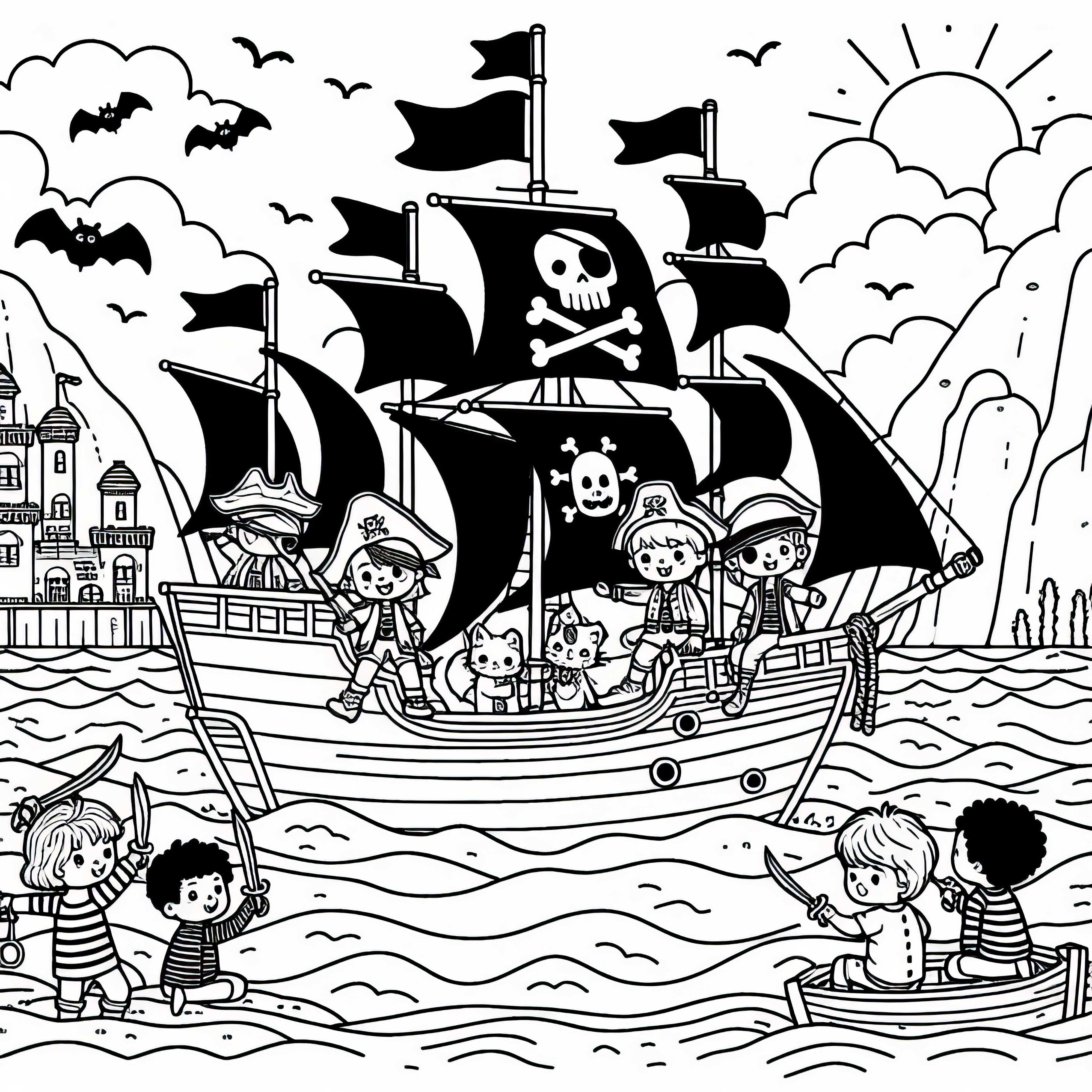 Дети креативно одеваются в пиратские шляпы и повязки на глаз – Раскраска бесплатно