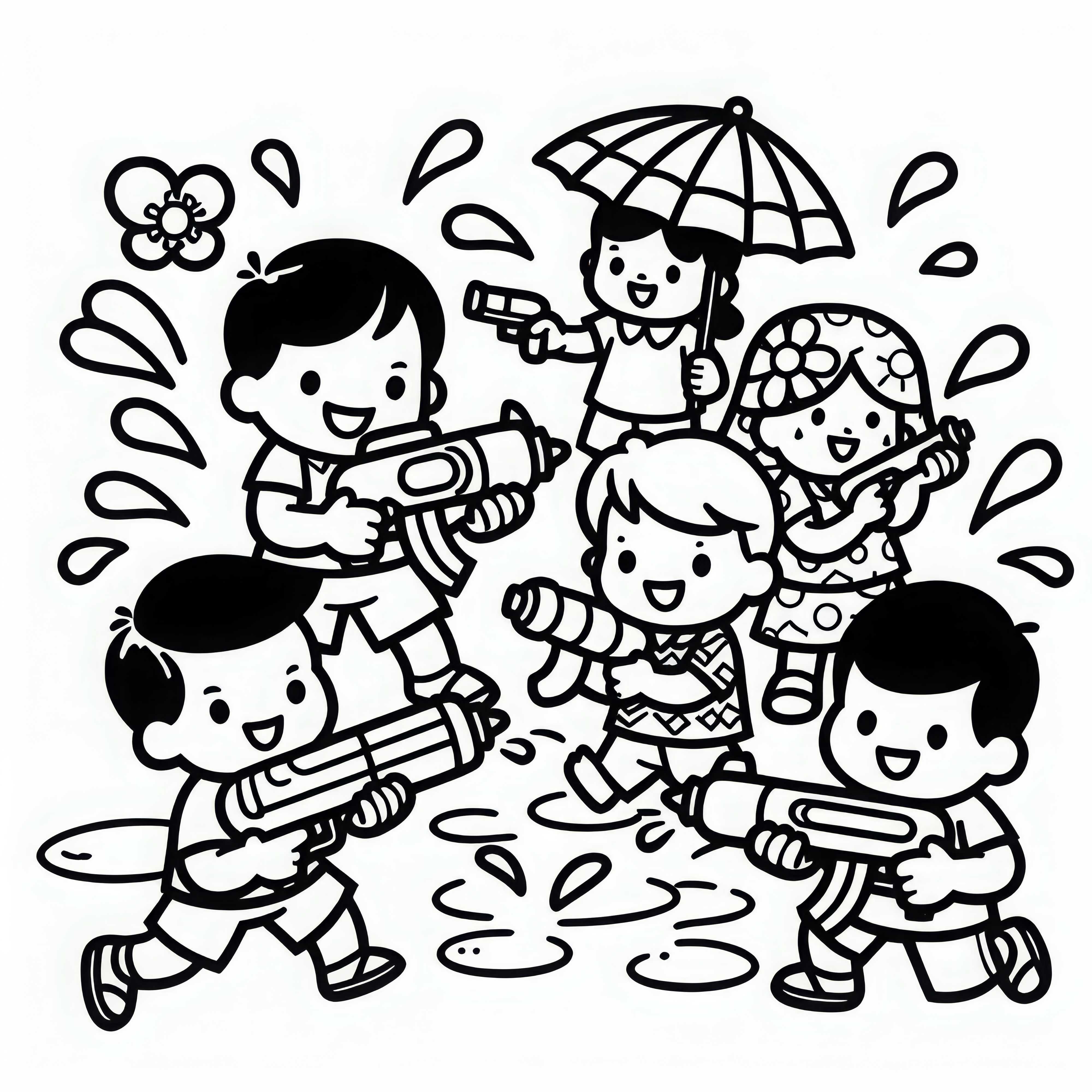 Дети бегут, смеясь, перед струями воды – бесплатная раскраска